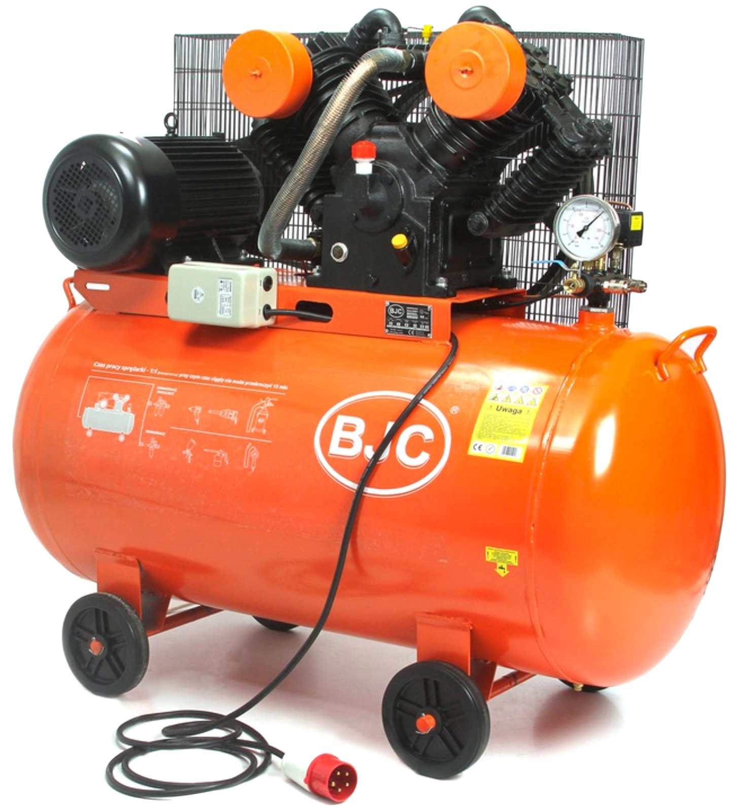 Kompresor BJC V-1,05T to potężna żeliwna czterotłokowa sprężarka tłokowa smarowana olejem o dwóch stopniach sprężania osadzona na 350 litrowym zbiorniku.