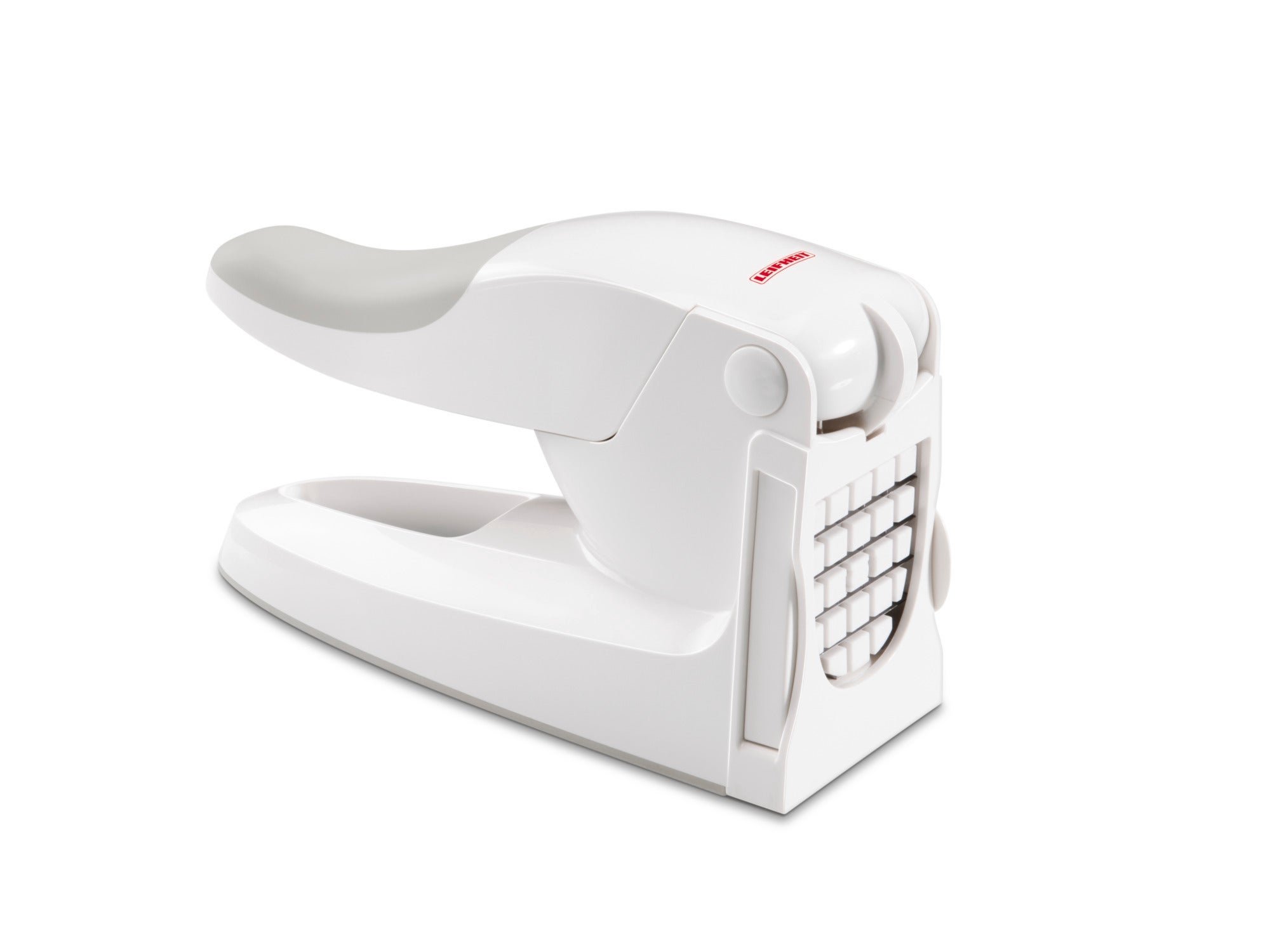 Z krajalnicą do frytek marki Leifheit szybko i wygodnie potniemy ziemniaki i inne warzywa w równe słupki, ułatwiając tym samym przygotowanie potraw i wzbogacając je. Wykonaną z eleganckiego tworzywa sztucznego obudowę w kolorze białym uzupełniają dwa wkłady tnące o grubości 10 i 12 mm. Ich wymiana zajmuje zaledwie kilka sekund i jest całkowicie bezpieczna. Pracę z krajalnicą ułatwia specjalnie wyprofilowany uchwyt, który posiada miękką w dotyku powierzchnię. Antypoślizgowa podstawa tego modelu gwarantuje zawsze idealną stabilność i zabezpiecza krajalnicę przed przesuwaniem się po blacie podczas cięcia warzyw.