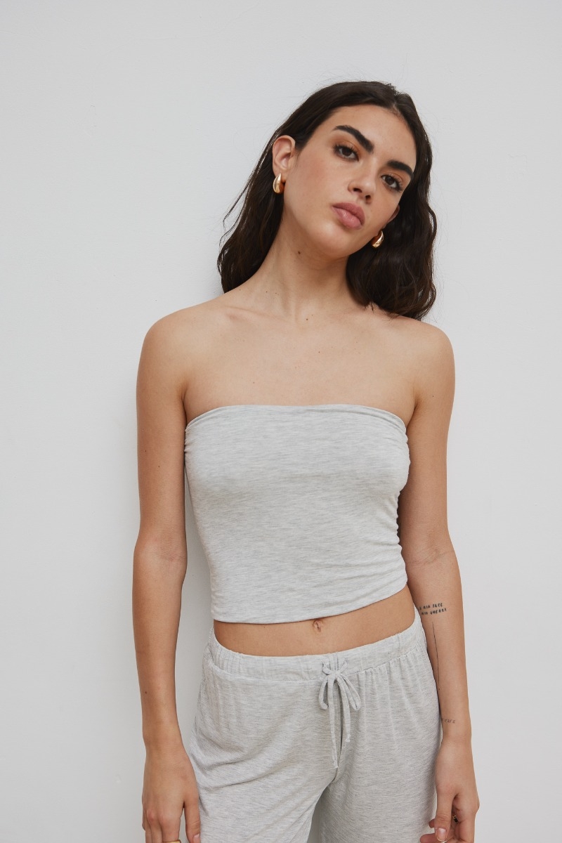 Krótki top wykonany z niezwykle przyjenej w dotyku tkaniny w kolorze szarym z efektem melanżu . Model który delikatnie otula kobiece ciało na wysokości biustu . Niezwykle wygodny , posiada ramiączek . Top jest uszyty z podwójnej warstwy tkaniny, nie prześwituje . Zachwyci fanki prostoty i wygody . Bądź gotowa na upalne lato z naszym topem ARRIEL. Idealny duet tworzy ze spodniai BERMEO z tej samej kolekcji . Gramatura dzianiny : 170g/m² Skład: 94% Modal, 6% Elastan Zalecana pielęgacja :