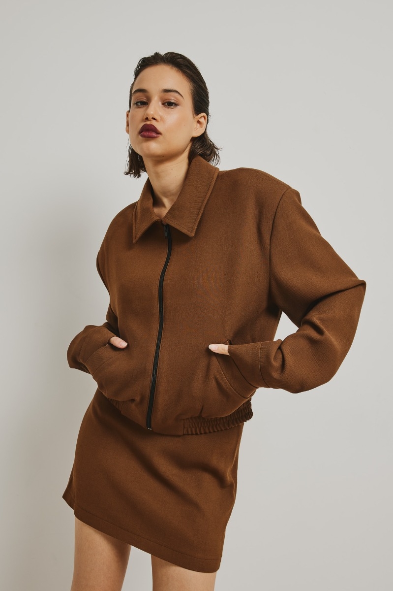 Marynarka wykonana z tkaniny w kolorze brązowym. Nasza krótka marynarka FRANKIE to idealny dodatek do Twojej garderoby który zapewni stylowy i niebanalny wygląd. Fason zapinany na zamek błyskwiczny z klasycznym kołnierzykiem. Rękawy wykończone mankietami które są zapinane na guziki. Całość wykończona gumą z klasycznym marszczeniem. Dodatkowo marynarka posiada z przodu dwie kieszonki. Tył marynarki jest zupełnie gładki. Wnętrze wykończone jest niezwykle przyjeną w dotyku podszewką . Jest to wszechstronnym elementem garderoby, który można dostosować do wielu okazji i stylów. Warto eksperymentować i dostosowywać ją do własnych preferencji i potrzeb. SKŁAD: Podszewka : 52% Poliester , 48% Wiskoza