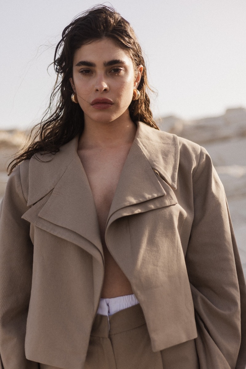 Marynarka o długości mini wykonana z tkaniny z dodatkiem lnu w kolorze beżowym. Fason z poduszkami oraz klasyczną linią ramion, oryginalne podwójne klapy z przodu połączone z kołnierzem . Ten model nie posiada guzików. Rękawy proste. Tył marynarki zupełnie gładki . Marynarka wykończona w środku niezwykle przyjemną w dotyku podszewką , co pzwoli na swobodne noszenie . Niezobowiązujący, oversize'owy fason marynarki powoduje, że możesz połączyć ją zarówno z mini spódniczką lub ze spodniami z wysokim stanem . Niezależnie od rodzaju stylizacji, marynarka nada jej stylowego i niebanalnego wykończenia. Jeśli jesteś fanką minimalistycznego stylu , ale mimo wszystko chciała byś zadać szyku- ten model jest dla Ciebie . Dostępna również w kolorze szarym , oraz granatowym . Skład: 65% Rayon , 32% Len 3% Spandex Podszewka : 52% Poliester, 48% Wiskoza ZALECANA PIELĘGNACJA: