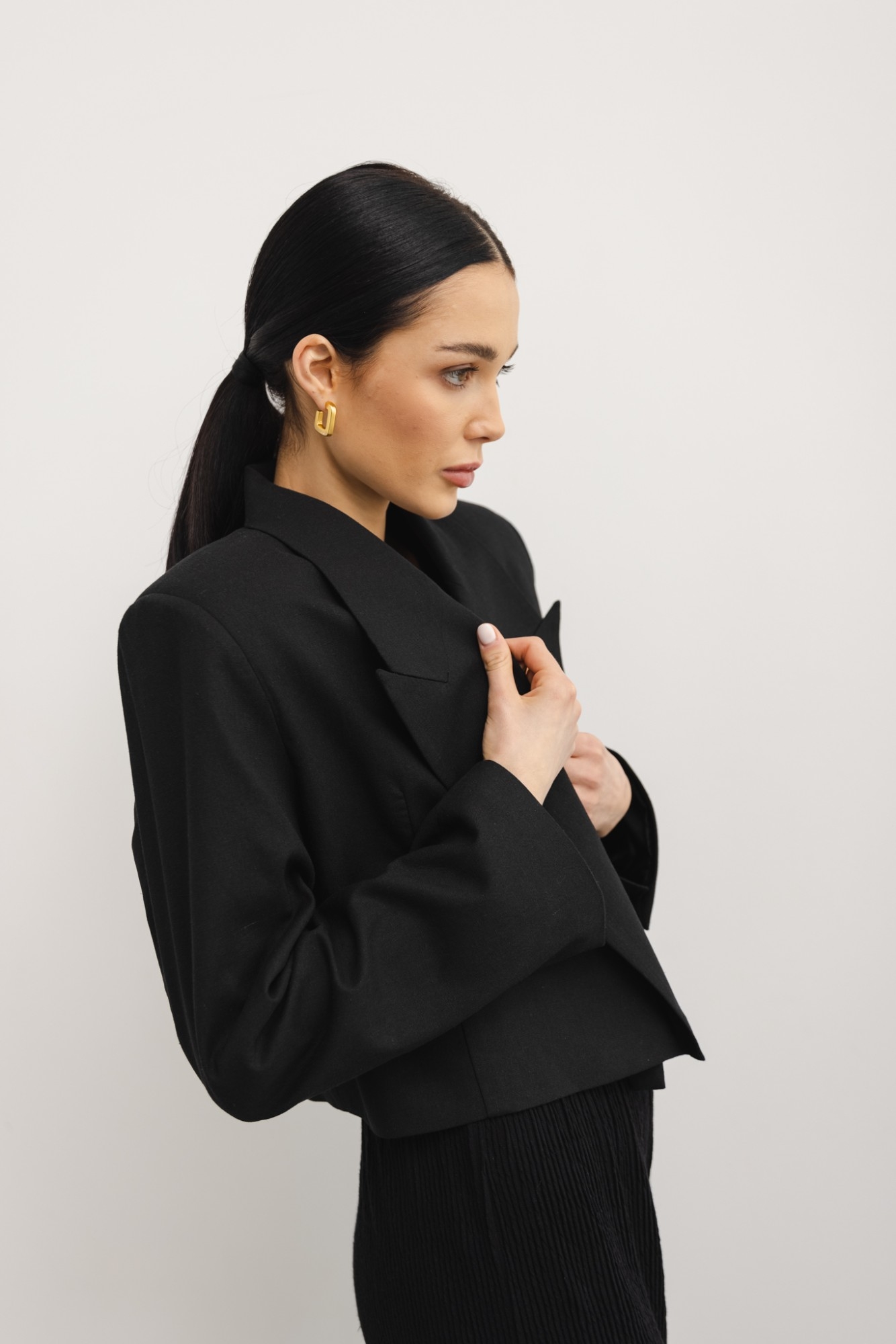 Marynarka o długości mini w kolorze czarnym z dodatkiem lnu . Fason z poduszkami oraz poszerzoną linią ramion, klapy z przodu połączone z kołnierzem oraz po lewej stronie ozdobna listwa w postaci ukrytej kieszonki. Ten model nie posiada guzików. Luźne rękawy zakończone niewielkim rozcięciem . Tył marynarki zupełnie gładki . Niezobowiązujący, oversize'owy fason marynarki powoduje, że możesz połączyć ją zarówno z mini spódniczką lub ze spodniami z wysokim stanem . Niezależnie od rodzaju stylizacji, marynarka nada jej stylowego i niebanalnego wykończenia. Jeśli jesteś fanką minimalistycznego stylu , ale mimo wszystko chciała byś zadać szyku- ten model jest dla Ciebie . Dostępna również w innych kolorach. SKŁAD : 48% Bawełna, 25% Len , 24% Wiskoza, 3% Elastan ZALECANA PIELĘGNACJA: