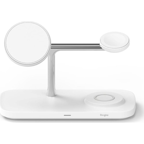 Ringke Qi2 3w1 Magnetic Wireless Charging Stand Dla urządzeń kompatybilnych z ładowaniem Qi i MagSafe Ładowarka 3w1 kompatybilna z MagSafe Ładowarka indukcyjna 3w1 Ringke T255 to doskonałe rozwiązanie dla osób szukających wygody i funkcjonalności. Dzięki modularnej budowie i solidnemu wykonaniu, urządzenie gwarantuje niezawodność i długowieczność. Wbudowane magnesy zapewniają pewne trzymanie ładowanych urządzeń, a antypoślizgowe gumki zapobiegają przesuwaniu się ładowarki. Dodatkowo, system bezpieczeństwa chroni urządzenia przed przegrzaniem i uszkodzeniami. Ładowarka pozwala na bezprzewodowe ładowanie kompatybilnych urządzeń, takich jak smartfony (do 15W), słuchawki czy zegarki. Zestaw zawiera kabel o długości 1 m, co pozwala na łatwe podłączenie i uniknięcie plątaniny kabli. Idealna do użytku w domu lub biurze, zapewnia wygodne i szybkie ładowanie Średnica ładowarki (smartfon): 6 cmŚrednica ładowarki (zegarek): 3,8 cmŚrednica ładowarki (słuchawki): 4,8 cmWymiary: 17,5 x 8,5 x 1,3 cm Kolor producenta: White (biała) * Do korzystania z ładowarki indukcyjnej w pełni jej możliwości, zalecamy podłączenie jej pod ładowarkę sieciową o mocy wyjściowej 35W (V*A) i więcej. ** Funkcja magnetyczna MagSafe działa tylko i wyłącznie bezpośrednio do telefonu lub do etui ze wbudowanym oczkiem magnetycznym o zastosowaniu MagSafe. ***Przedmiotem sprzedaży jest sama ładowarka indukcyjna z kablem, pozostałe akcesoria widoczne na zdjęciach służą jedynie przedstawieniu jej funkcjonalności. Zestaw zawiera: 1 x Ładowarka 3w1 Ringke T255 1 x Kabel USB-C o długości 100 cm 1 x Instrukcja obsługi w języku angielskim Solidna budowa Ładowarka Ringke Wykonana z trwałych materiałów, takich jak ABS, stali nierdzewnej oraz dodatków silikonowych, ładowarka wyróżnia się nowoczesnym designem i stonowaną kolorystyką, pasującą do każdego wnętrza a dioda LED to kolejna przydatna funkcja, która informuje o stanie ładowania. Dzięki elastyczności użytkowania, ładowarkę możesz ustawić w trybie wertykalnym lub horyzontalnym. To idealne rozwiązanie, gdy chcesz naładować swojego smartfona i jednocześnie oglądać filmy w trybie pełnoekranowym, bez zakłóceń. Z Ringke T255 ładowanie staje się nie tylko szybkie, ale i wygodne. Bezpieczne ładowanie Twoich urządzeń Dzięki systemowi ochronnemu możesz spać spokojnie, wiedząc, że Twoje urządzenia są bezpieczne: bez przegrzania, bez przepięć i utrzymując stałą niską temperaturę podczas ładowania - tylko czyste, bezpieczne ładowanie, nawet pozostawiając urządzenia na ładowarce przez kilka godzin. Dzięki technologii Qi2, urządzenia kompatybilne z tą funkcją ładują się znacznie szybciej niż przy użyciu starszych standardów. Qi2 to także poprawiona stabilność ładowania oraz zwiększona efektywność energetyczna, co przekłada się na mniej ciepła generowanego podczas ładowania i dłuższą żywotność urządzeń. Specyfikacja Model: T255W Materiał: ABS, stal nierdzewna, silikon Wymiary: 175 x 120 x 85 mm Waga: 258g Zasilanie USB-C: PD/QC3.0 9V/3A, 12V/2A Wyjście Magsafe: 5W/7,5W/15W QI2 Moc wyjściowa Apple Watch: 3 W Wyjście bezprzewodowej ładowarki w podstawie (Airpods, Galaxy Watch, Galaxy Buds 3W): maks. 5 W Ilość urządzeń ładowania jednocześnie: 3 W zestawie: kabel USB-C - USB-C o długości 1m, instrukcja obsługi