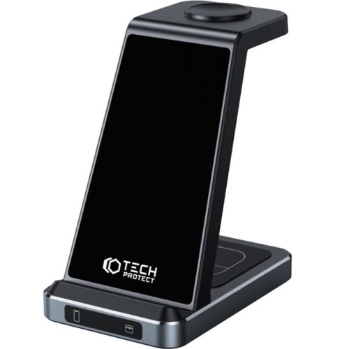 Tech-Protect Qi 15W-A26 3w1 Wireless Charger Dla smartfonów z bezprzewodowym ładowaniem Qi, Apple Watch (nie działa z Galaxy Watch)Dla serii AirPods z etui ładującym bezprzewodowo lub Samsung Galaxy Buds   Potrójne ładowanie bez ograniczeń! Ładowarka indukcyjna Tech-Protect A26 3in1 Wireless Charger umożliwia ładowanie aż trzech urządzeń w tym samym czasie i miejscu. Niezależnie od tego, czy potrzebujesz naładować telefon z systemem iOS lub Android, smartwatch czy słuchawki z funkcją bezprzewodowego ładowania ten gadżet jest gotowy spełnić Twoje potrzeby. Kolor producenta: Black (czarny)  Do ładowarki został dołączony kabel USB-A / USB-C o długości 1m. * Uwaga! W celu prawidłowego działania urządzenia wymagana jest ładowarka sieciowa o mocy min. 35W     Ładowarka, która pasuje wszędzie Ma prosty, stonowany design z błyszczącym wykończeniem. Dzięki niewielkim rozmiarom łatwo znajdzie miejsce w każdym pomieszczeniu. Jest praktyczna i mobilna, umożliwiając ładowanie urządzeń w domu i pracy. Jej elegancki wygląd i funkcjonalność sprawiają, że doskonale pasuje do każdego wnętrza.      Specyfikacja Co więcej, jeśli chcesz naładować tylko jedno urządzenie, możesz to zrobić równie łatwo, korzystając z wybranego miejsca na ładowarce. Prąd wejściowy USB-C: 9V/2A, 12V/1.5A Moc wyjściowa Smartphone: 15W/10W/7.5W/5W Moc wyjściowa Watch: 3W Moc wyjściowa Earphone: 3W   Bezpieczeństwo ładowania! Dzięki wbudowanemu systemowi ochrony podłączone akcesoria są bezpieczne zarówno przed przegrzaniem, jak i przepięciami. Nie musisz się martwić o długotrwałe pozostawienie urządzeń w ładowarce, ponieważ są one w pełni chronione.  Dodatkowym atutem są podświetlane ikony LED informujące o statusie ładowania.