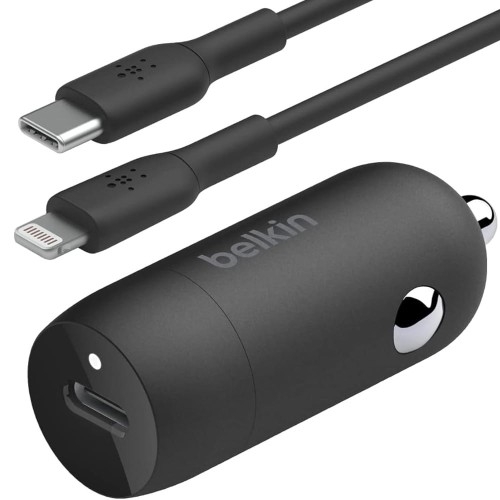 Belkin Boost↑Charge Car Charger USB-C PD3.0 PPS 30W with USB-C/Lightning Cable Uniwersalna / USB-C + kabel Lightning   Ładowarka samochodowa z kablem Lightning Kompaktowa i lekka ładowarka samochodowa marki Belkin z serii Boost↑Charge z dołączonym dedykowanym kablem USB-C/Lightning. Taki zestaw doskonale nada się do ładowania wszelkich urządzeń mobilnych od Apple, posiadających port Lightning. To świetne rozwiązanie do uzupełnienia energii w ich baterii podczas podróży do pracy czy wycieczek na urlopie. Port USB-C Power Delivery 3.0 z funkcją dynamicznej mocy wyjściowej PPS został wyposażony w technologię, która wykrywa możliwie maksymalne natężenie prądu do 3A dla danego urządzenia, co zdecydowanie skraca czas ładowania względem standardowych ładowarek. *Przedmiotem sprzedaży jest sama ładowarka samochodowa z dedykowanym kablem, pozostałe akcesoria widoczne na zdjęciach służą jedynie przedstawieniu jej funkcjonalności. Długość kabla: 1m Kolor producenta: Black (czarna)     Szybkie ładowanie 30W z PD3.0 + PPS Ładowarka zapewnia bezpieczeństwo ładowanego urządzenia dzięki zabezpieczeniu przeciwprzepięciowym, a niewielkie rozmiary zapewniają komfort użytkowania. W pudełku znajdziesz także dedykowany kabel USB-C do Lightning o długości 1m, który dostosowany jest swoją przepustowością i funkcjonalnością do opisywanej ładowarki samochodowej, aby maksymalnie wykorzystać możliwości ładowania urządzeń kompatybilnych z jej technologiami. Dzięki zastosowaniu portu USB-C obsługującego certyfikowaną technologię Power Delivery 3.0 szybko i wydajnie naładujesz swoje kompatybilne urządzenie. Ponadto obsługiwana technologia PPS zapewnia dynamiczną moc wyjściową, oferując automatyczne modyfikowanie napięcia i prądu w czasie rzeczywistym, aby dostarczać maksymalną moc w oparciu o stan ładowania urządzenia. Wejście: 12V / 24V Wyjście USB-C (max 30W): profile mocy PDO: [5V/3A], [9V/3A], [12V/2.5A], [15V/2A] PPS: [3.33V-11V/3A] To uniwersalna ładowarka przeznaczona głównie dla smartfonów i tabletów kompatybilnych z PD3.0 / PPS.       Elegancki i kompaktowy design Produkt marki Belkin posiada matowe wykończenie i elegancki design oraz wbudowaną diodę LED, która sygnalizuje dopływ prądu do ładowarki. Niewielkie rozmiary pozwalają wygodnie zabrać ją w każdą podróż. Wymiary: 54 x 20 mm       Jakość potwierdzona certyfikatami Certyfikat USB-IF: produkt został certyfikowany przez organizację USB-IF, co potwierdza spełnienie wszelkich wymaganych standardów jakościowych, elektrycznych, mechanicznych i środowiskowych, itp., zapewniając tym samym bezpieczeństwo i wydajność jego użytkowania. Certyfikat MFI oznacza zgodność z wymogami producenta Apple w celu spełnienia wszystkich standardów wydajnościowych jak i bezpieczeństwa podłączonych urządzeń.       Gwarancja bezpieczeństwa Ładowarki firmy Belkin są tak skonstruowane, aby zapewnić możliwie najlepsze zabezpieczenie urządzenia podczas ładowania. Inteligentny układ mierzy napięcie i automatycznie dostosowuje odpowiednio maksymalną moc ładowania. Belkin zapewnia gwarancję bezpieczeństwa podłączonego sprzętu o wartości 2'000 Euro. Jeśli sprzęt zostanie uszkodzony przez ładunek elektryczny podczas prawidłowego podłączenia do ładowarki, Belkin naprawi lub wymieni urządzenie na nowe.
