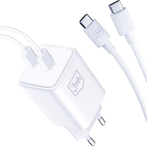 Ładowarka sieciowa 3mk Hyper Charger PD 45W Uniwersalna  / 2x USB-C   Podwójne ładowanie! Poznaj ładowarką Hyper Charger! Dzięki mocy 45W w pełni wykorzystasz potencjał superszybkiego ładowania 2.0, który w błyskawicznym tempie przywróci energię Twoim urządzeniom Samsung. To nie wszystko! Z dwoma portami USB-C możesz naładować jednocześnie dwa urządzenia, bez względu na markę czy model. Czy to najnowszy smartfon, tablet czy inne akcesoria 3mk zadba o szybkie i efektywne ładowanie każdego z nich. Wybierz ładowarkę, która nie tylko dotrzyma kroku Twoim potrzebom, ale również zapewni komfort i wygodę codziennego użytkowania. Kolor producenta: White (biały)  *Szybkie ładowanie (PD i QC) kompatybilne jest ze smartfonami obsługującymi tę technologię. W pozostałych modelach prędkość ładowania będzie dostosowana do możliwości urządzenia.     Pełny zestaw, pełna wygoda! Marzysz o wygodzie, którą łączy opcja all-inclusive? W takim razie to dla Ciebie coś wyjątkowego! Otrzymujesz nie tylko ładowarkę, ale także dwa solidne kable USB-C/USB-C, które wspierają szybkie ładowanie. Wyobraź sobie to: żadnego stresu związanego z dobieraniem kabli, żadnych dodatkowych kosztów ani ukrytych wydatków. Po prostu wyciągasz z opakowania, podłączasz i cieszysz się błyskawicznym ładowaniem. Postaw na kompletny zestaw i doświadcz prawdziwej ulgi – już dziś!         Specyfikacja godna uwagi! Maksymalna moc: 45W Moc wyjściowa USB-C PD: 3.3-11V/4.05A, 3.3-16V/2.8A Prąd wyjściowy: USB-C1+C2: 25W + 20W (45W) USB-C1/C2: 5V/3A, 9V/3A, 15V/3A, 20V/2.25A (45W) Wspierające protokoły: QC3.0 QC4+ AFC PD 3.0 Samsung Super-Fast Charge 2.0 Apple2.4A     Energia w każdej chwili! Została stworzona, aby nie tylko utrzymać baterię w doskonałej kondycji, ale także zapewnić Ci nieprzerwaną moc w każdej sytuacji. Dzięki innowacyjnym technologiom, takim jak Super Quick Charge 2.0, Power Delivery 3.0 i PPS, Twoje urządzenia zyskują dokładnie tyle energii, ile potrzebują, by błyskawicznie, wrócić do działania. Wykorzystuje materiały ogniotrwałe klasy V0, które są odporne na ekstremalne temperatury, gwarantując Ci bezpieczne użytkowanie w każdych warunkach.      Zmieści się wszędzie! Nie pozwól, aby rozmiar i waga ograniczały Twoją mobilność. Dzięki technologii GaN (azotek galu), łączy potężną efektywność z kompaktowym designem. Zwiększona moc ładowania oznacza, że Twoje urządzenia będą zasilane szybciej niż kiedykolwiek wcześniej, a jednocześnie urządzenie jest na tyle małe, że zmieści się w każdej kieszeni. Od teraz bez względu na to, gdzie jesteś, pozostaniesz w kontakcie z bliskimi, bez obciążania torby czy plecaka.