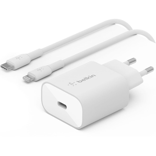 Belkin Boost↑Charge Wall Charger with USB-C to Lightning Cable, PD 3.0, PPS - 25W Uniwersalna / USB-C + kabel Lightning   Wygodna i elegancka ładowarka sieciowa z kablem USB-C / Lightning Oryginalna ładowarka sieciowa marki Belkin z serii Boost↑Charge zoptymalizowana dla smartfonów Apple iPhone (25W) i Samsung Galaxy (25W), lecz dzięki jej uniwersalności można używać jej z wszelkimi urządzeniami posiadającymi kabel ze złączem USB typu C. Ładowarka posiada elegancki i nowoczesny design o kompaktowej budowie. Port USB-C Power Delivery 3.0 / PPS został wyposażony w technologię, która wykrywa możliwie maksymalne natężenie prądu dla danego urządzenia, co znacznie skraca czas ładowania względem standardowych ładowarek. Do ładowarki dołączono kabel USB-C / Lightning co stanowi świetny zestaw do ładowania smartfonów iPhone z serii 14 i starszych, a także innych akcesoriów Apple posiadających to złącze. *Przedmiotem sprzedaży jest sama ładowarka z kablem, pozostałe akcesoria widoczne na zdjęciach służą jedynie przedstawieniu jej funkcjonalności. Długość kabla: 1m Kolor producenta: White (biały)     Optymalizacja dla Samsung i iPhone Uniwersalna ładowarka Belkin naładuje Twój smartfon, tablet, czy inne urządzenie z optymalną, możliwie najszybsza prędkością. Pomimo swojej uniwersalności jej dodatkową zaletą jest optymalizacja ładowania dla smartfonów Samsung i iPhone. Ładowarka wyposażona została w technologię dynamicznego ładowania PPS, która wykrywa podłączone urządzenie i negocjuje najlepszą ilość mocy wyjściowej wymaganej do wydajnego ładowania, dostarczając do 25W max dla smartfonów Samsung, oraz do 25W max dla smartfonów iPhone, w zależności od rozpoznanych parametrów. Dołączony kabel USB-C/Lightning cechuje się przepustowością odpowiadającą maksymalnym możliwościom ładowarki, dzięki czemu otrzymujesz kompletny zestaw gotowy do użytku dla urządzeń od Apple wyposażonych w port ładowania Lightning. Wyjście: USB-C PD 3.0 PPS 25W max: [5V/3A/15W], [9V/2.77A/25W], [3.3V–5.9V/3A/12W–15W], [3.3V–11V/2.25A/7.5W–25W]       Kompaktowy design Minimalistyczny i kompaktowy design ładowarki prezentuje się smukło i stylowo. Doskonale sprawdzi się w ciasnym szeregu gniazdek na listwach zasilających, a ponadto równie łatwo zmieścisz ją w torebce czy plecaku, co czyni ją doskonałą ładowarką podróżną. Przeznaczona do użytku wewnętrznego. Zalecane temperatury pracy i przechowywania: Temperatura przechowywania: od -20°C do 85°C przy wilgotności względnej od 5% do 95% Temperatura pracy: od 0°C do 35°C przy wilgotności względnej od 10% do 90% Wymiary: 7,3 cm 4,3 cm 2,6 cm       Gwarancja bezpieczeństwa Ładowarki firmy Belkin są tak skonstruowane, aby zapewnić najlepsze zabezpieczenie urządzenia podczas ładowania. Inteligentny układ mierzy napięcie i automatycznie dostosowuje odpowiednio maksymalną moc ładowania. Belkin zapewnia gwarancję bezpieczeństwa podłączonego sprzętu o wartości do 2,000 Euro. Jeśli sprzęt zostanie uszkodzony przez ładunek elektryczny podczas prawidłowego podłączenia do ładowarki, Belkin naprawi lub wymieni urządzenie na nowe.