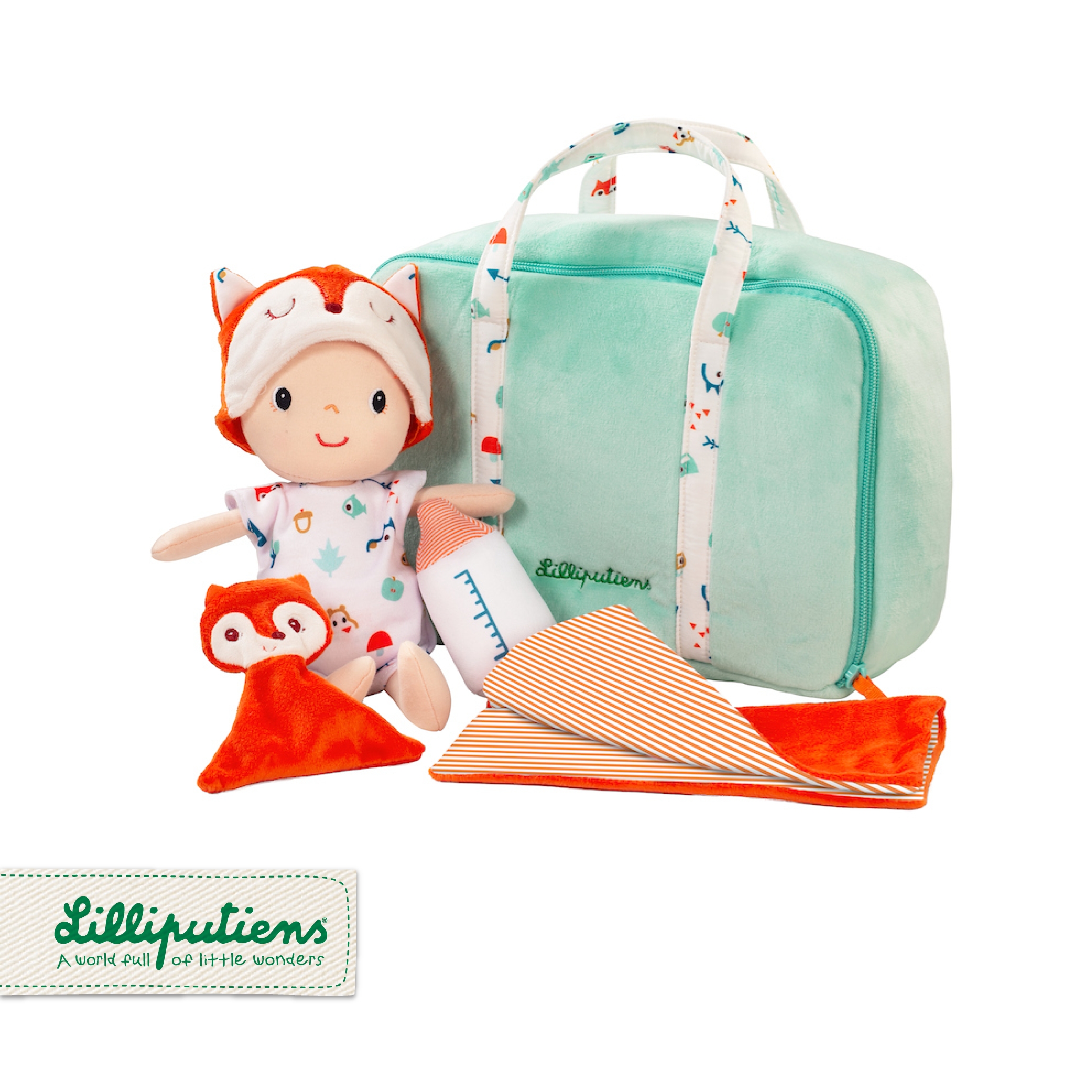 Miękka jasnoturkusowa walizeczka na suwak, z wygodnymi uchwytami do przenoszenia, może pełnić rolę łóżeczka dla laleczki.