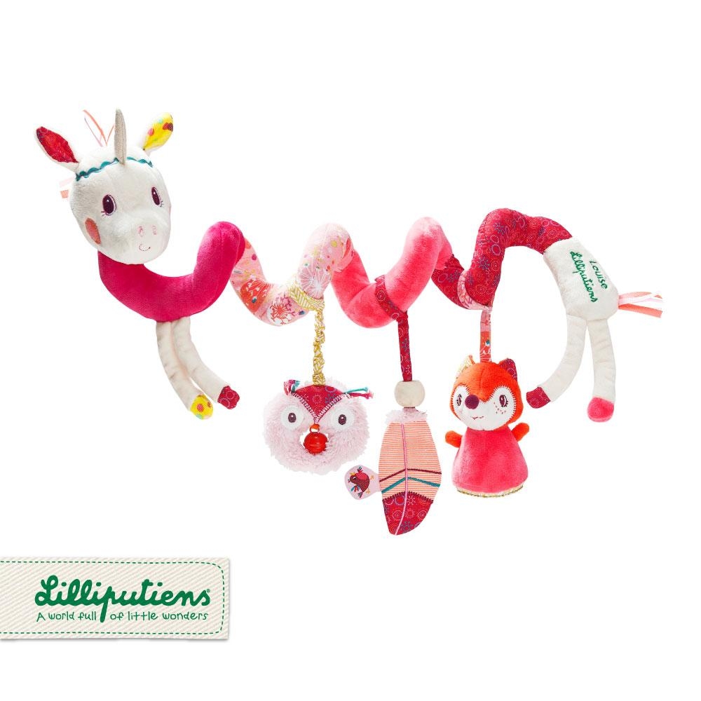 Ma postać ślicznego biało-różowego jednorożca w formie długiej spirali, którą można owinąć wokół pałąka wózka, nosidełka, fotelika samochodowego czy barierki łóżeczka. Znajdują się na niej kolejno: