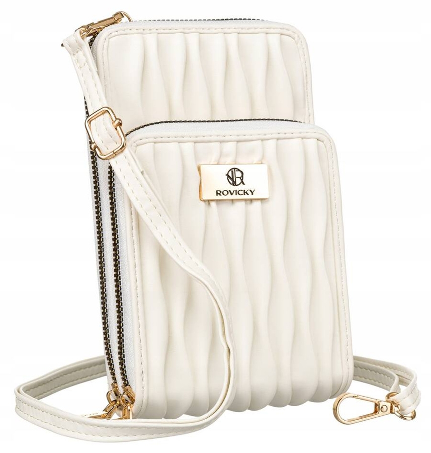 Biała mini torebka wykonana ze skóry ekologicznej z plisowanym wzorem. Torebka posiada 6 przegródek na karty i dokumenty, zmieści też bilon i banknoty. Dwukomorowa, zapinana na praktyczny i solidny suwak.