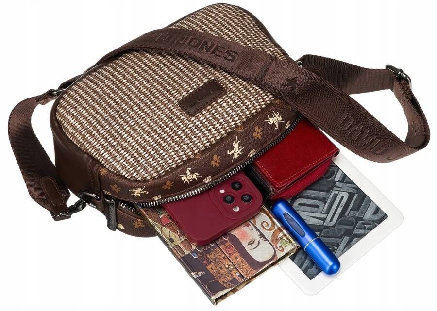 Model precyzyjnie wykonany z najwyższej jakości skóry ekologicznej. Torebka z ozdobnym przednim panelem wykonanym z tkaniny. Środek na podszewce. Torba jednokomorowa na suwak, wyposażona w 2 dodatkowe kieszonki. Zawieszona na długim pasku.