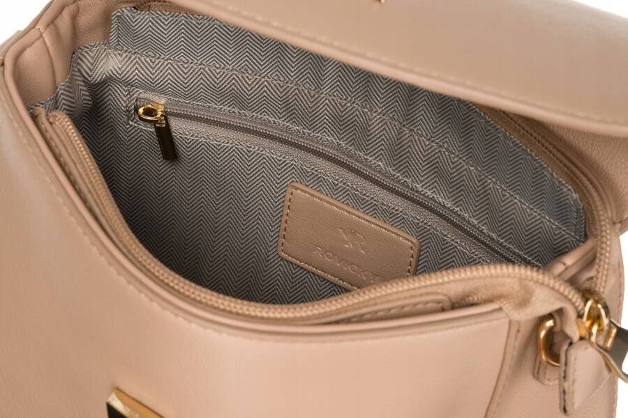 Torebka odszyta ze skóry ekologicznej o gładkiej fakturze. Zamykana klapką na zatrzask i zamkiem błyskawicznym. Wszystkie okucia w torebce mają złoty kolor. Wyposażona w 2 kieszenie wewnętrzne i 1 zewnętrzną. Zawieszona na długim, regulowanym pasku.