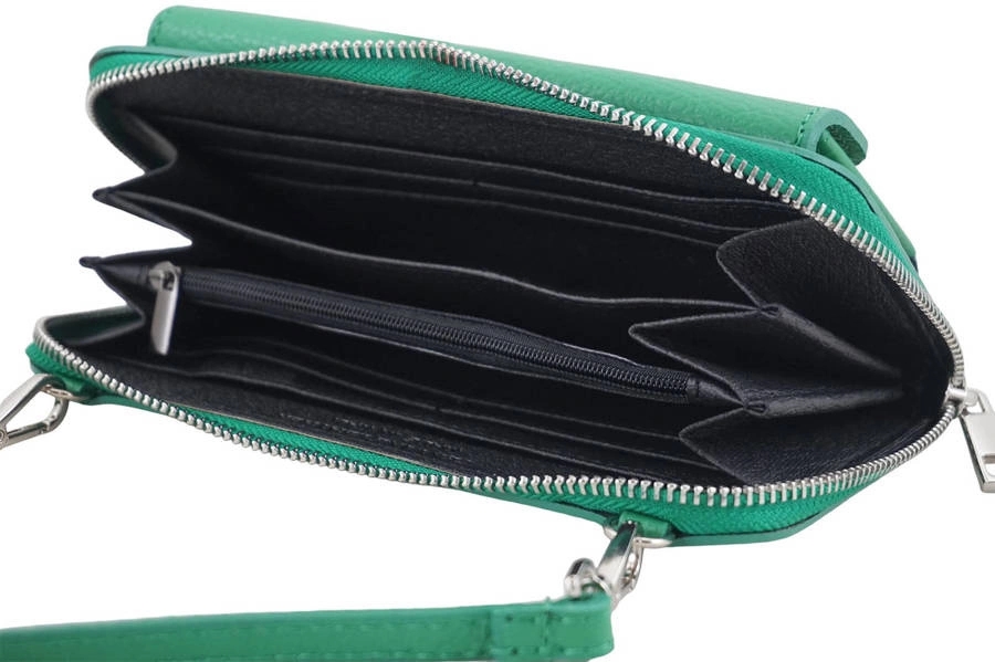 Portfel z etui na telefon ze skóry licowej zielony jasny to również mini torebka po doczepieniu długiego i regulowanego paska. Idealna do każdej stylizacji, niezbędny dodatek codziennej garderoby. Niewielki rozmiar powoduje, iż zmieścisz etui w torebce lub możesz swobodnie nosić przewieszone przez ramię. Portfel z etui na telefon ze skóry licowej to propozycja dla kobiet poszukujących modnych akcesoriów galanterii skórzanej. Sklep internetowy oferuje wiele modeli torebek na różne okazje oraz portfeli skórzanych, a także szybką i profesjonalną obsługę Państwa zamówienia. Zapisz się do naszego newslettera i odbierz rabat -15% na pierwsze zakupy. Gwarantujemy produkty z wysokiej jakości skóry naturalnej, wykonanych z dbałością o szczegóły, z subtelnymi dodatkami oraz modelami z najnowszych kolekcji galanterii skórzanej Dla Pań i Panów.