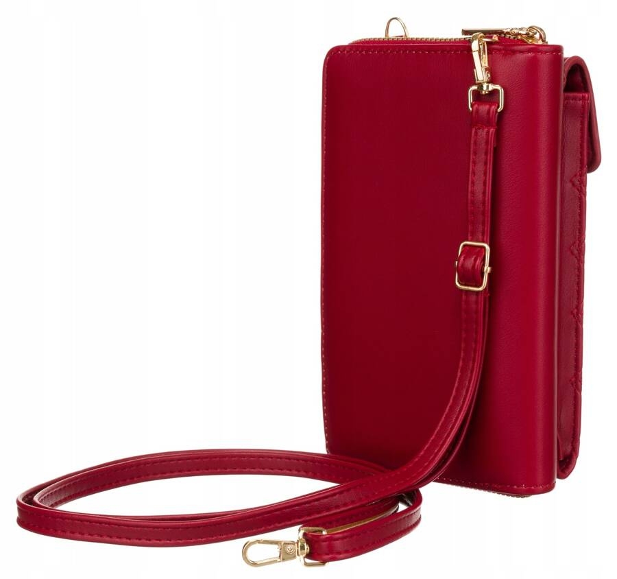 Torebko-portfel w fasonie piórnika zapinany na zamek. Na froncie kieszonka na telefon zapinana klapką na zatrzask magnetyczny. Wewnątrz 4 miejsca na karty i 1 kieszonka na suwak. Posiada odpinany, regulowany pasek. Elegancki, pikowany panel na froncie.