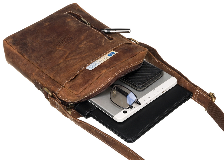 Dwukomorowa torba męska ze skóry naturalnej. Wyposażona w dwie kieszenie wewnętrzne i dwie zewnętrzne znajdujące się na froncie i rewersie. Torba z wygodnym, regulowanym paskiem na ramię.