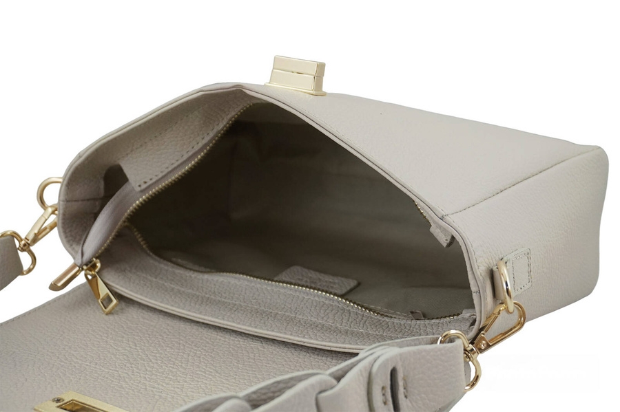 Wnętrze torebki: klasyczna skórzana torebka na ramię z plecionym paskiem jest jednokomorowa, wykończona podszewką, posiada złote okucia. Wewnątrz wyodrębniono małą zasuwaną kieszonkę. Torebka jest zasuwana oraz dodatkowo zamykana ozdobnym złotym zapięciem. Dużym atutem tego modelu jest również możliwość noszenia torebki, w zależności od okazji, na ozdobnym uchwycie lub dopinanym regulowanym dłuższym pasku z regulacją (długość plecionego uchwytu: 60cm, wysokość 27cm, szerokość 3cm; maksymalna dł. dodatkowego paska z regulacją: 112cm, wys. 54cm, szer. 1,7cm). Na usztywnionym spodzie znajdują się metalowe stopki chroniące torebkę przed otarciem. Skórzana torebka na ramię z plecionym paskiem to propozycja dla Pań ceniących gustowne dodatki codziennej garderoby, zwracających uwagę na jakość i estetykę wykonania produktu ze skóry naturalnej.
