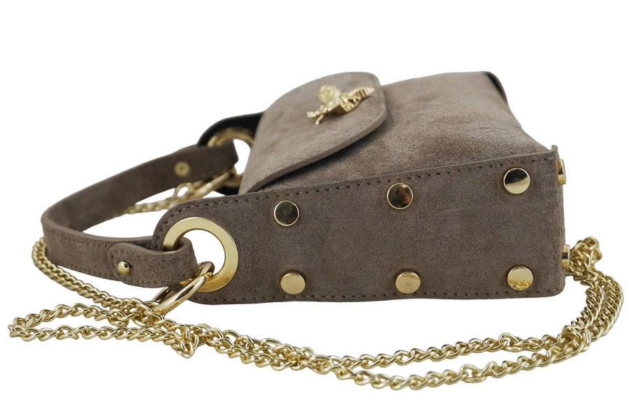 Wnętrze torebki: modne zamszowe torebki wizytowe z ozdobnym zapięciem oraz złotymi nitami są jednokomorowe, surowo wykończone. Posiadają złote okucia, krótki uchwyt do ręki (długość 25cm, wysokość 11cm, szerokość 1,8cm) oraz doczepiany złoty łańcuszek (długość 110cm, wysokość 58cm). Uniwersalny fason, rozmiarowo idealny aby pomieścić niezbędne rzeczy - telefon, portfel oraz drobne kosmetyki. Wyjątkowe zamszowe torebki wizytowe są dostępne w szerokiej palecie kolorów - wybierz idealny dla Ciebie i wyróżnij stylizację torebką z naszego sklepu - w najnowszej kolekcji znajdziesz wiele modeli torebek skórzanych, plecaków oraz torebek klasycznych.