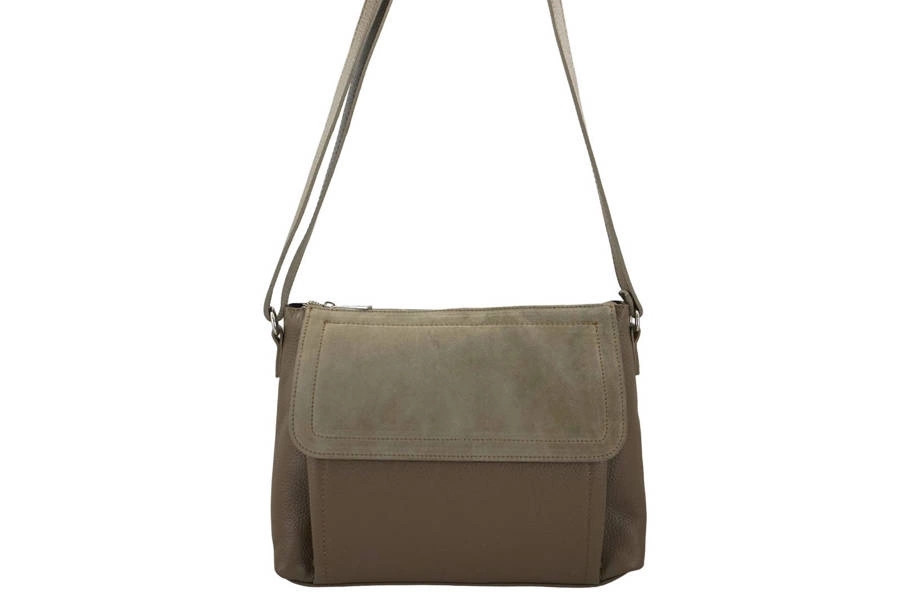 Wnętrze torebki: pojemna torebka skórzana z zamszową klapką jest jednokomorowa, wykończona podszewką. Wewnątrz wyodrębniono małą zasuwaną kieszonkę oraz kieszeń mieszczącą telefon. Z tyłu torebki znajduje się poręczna zasuwana kieszeń. Dodatkowo pod klapką znajduje się duża kieszeń zapinana na zatrzask (wymiary kieszeni: wysokość 16cm, szerokość 23cm). Wewnętrzne lub zewnętrzne kieszenie doskonale uporządkują drobne rzeczy, np. klucze, portfel, telefon oraz kosmetyki. Praktyczna torebka skórzana z zamszową klapką jest zasuwana, posiada srebrne okucia, wygodnej długości pasek z regulacją, mocowany na stałe (maksymalna dł. 120cm, maksymalna wys. 54cm, szerokość paska 2cm). Proponowana w najnowszej kolekcji pojemna torebka skórzana z zamszową klapką oraz z dużą ilością praktycznych kieszeni podkreśli codzienne klasyczne stylizacje.