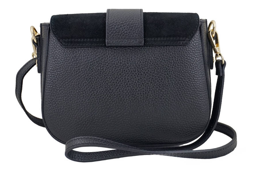Torebka listonoszka z zamszową klapą w kolorze czarnym jest wykonana ze skóry naturalnej licowej w połączeniu ze skórą naturalną zamszową. Idealna propozycja wśród torebek na każdy dzień - klasyczna torebka urozmaicona ozdobnie wyciętą klapką, z długim regulowanym paskiem umożliwia noszenie torebki na ramieniu lub wygodnie przewieszonej przez ramię. W naszym asortymencie czekają na Ciebie skórzane torebki typu “listonoszka”, które dopasujesz zarówno do okazji, jak i Twojego stylu. Oferowane w najnowszej kolekcji torebki zaprojektowano tak, aby mieściły portfel, telefon, klucze oraz drobne kosmetyki. Torebka listonoszka z zamszową klapą to propozycja dla Pań ceniących gustowne dodatki codziennej garderoby, zwracających uwagę na jakość i estetykę wykonania produktu ze skóry naturalnej. Zachęcamy do zapoznania się ze szczegółową ofertą klasycznych torebek damskich skórzanych. Oferujemy również duży wybór portfeli ze skóry lakierowanej lub z kolorowym wnętrzem, zapakowanych w ozdobne, dopasowane pudełko.