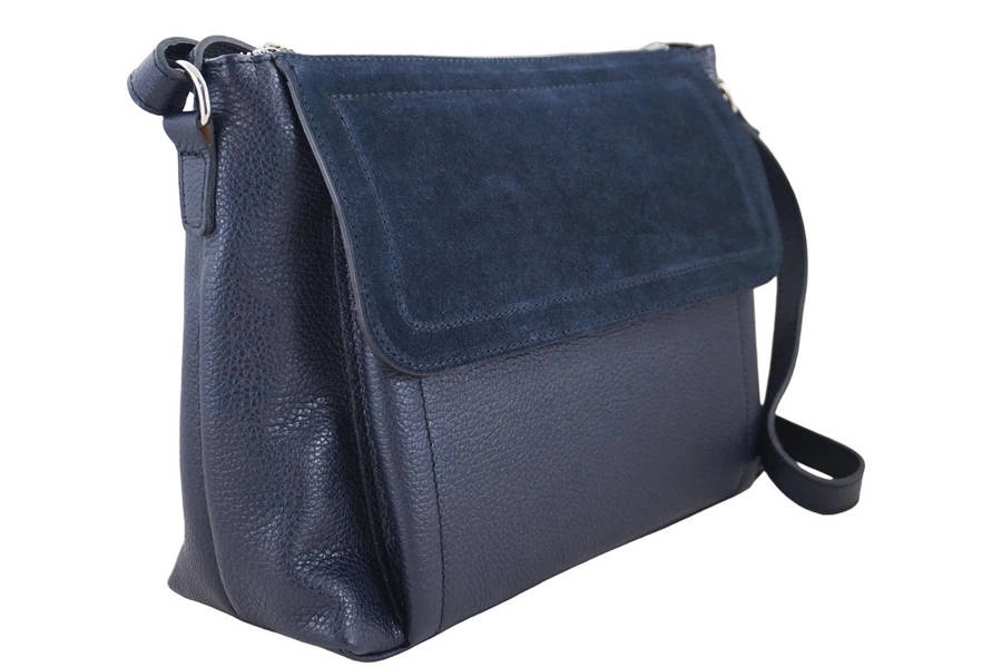 Wnętrze torebki: pojemna torebka skórzana z zamszową klapką jest jednokomorowa, wykończona podszewką. Wewnątrz wyodrębniono małą zasuwaną kieszonkę oraz kieszeń mieszczącą telefon. Z tyłu torebki znajduje się poręczna zasuwana kieszeń. Dodatkowo pod klapką znajduje się duża kieszeń zapinana na zatrzask (wymiary kieszeni: wysokość 16cm, szerokość 23cm). Wewnętrzne lub zewnętrzne kieszenie doskonale uporządkują drobne rzeczy, np. klucze, portfel, telefon oraz kosmetyki. Praktyczna torebka skórzana z zamszową klapką jest zasuwana, posiada srebrne okucia, wygodnej długości pasek z regulacją, mocowany na stałe (maksymalna dł. 120cm, maksymalna wys. 54cm, szerokość paska 2cm). Proponowana w najnowszej kolekcji pojemna torebka skórzana z zamszową klapką oraz z dużą ilością praktycznych kieszeni podkreśli codzienne klasyczne stylizacje.