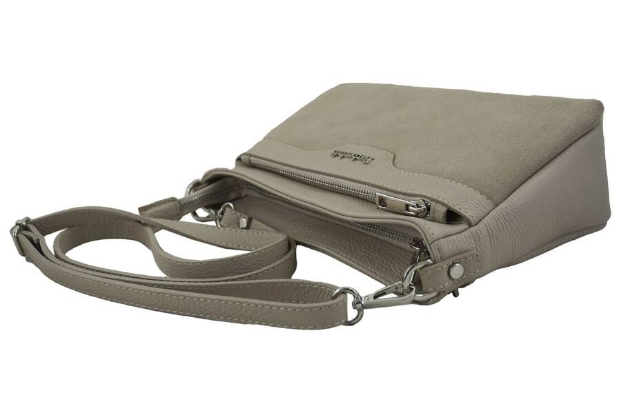 Wizytowa torebka damska skórzana została wykonana ze skóry naturalnej licowej w połączeniu ze skórą naturalną zamszową. Funkcjonalna oraz wygodna wizytowa torebka damska skórzana została zaprojektowana dla kobiet ceniących swobodę, dbających o każdy szczegół codziennej garderoby, poszukujących klasycznych torebek z delikatnymi i subtelnymi ozdobami. Ten model listonoszki wyróżnia zamszowy przód dopasowany do koloru skóry licowej, piękna stonowana kolorystyka oraz solidne wykonanie z materiału najwyższej jakości. Duża oferta wygodnych i praktycznych listonoszek, worków skórzanych, aktówek damskich i męskich oraz portfeli przemawia za wyborem produktu z kolekcji skórzanej Dla Niej i Dla Niego.