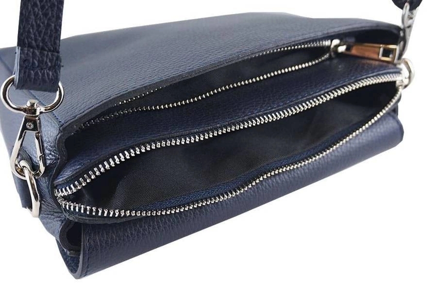 Wnętrze listonoszki: torebka listonoszka damska posiada dwie odrębne komory zamykane na suwak, wykończone podszewką. Pod klapką zapinaną zatrzaskiem magnetycznym znajduje się szeroka kieszeń mieszcząca mniejszy notes, kalendarz lub dokumenty. Torebka listonoszka damska posiada długi regulowany pasek (maksymalna długość 123cm), srebrne okucia, jest również lekko usztywniona.
