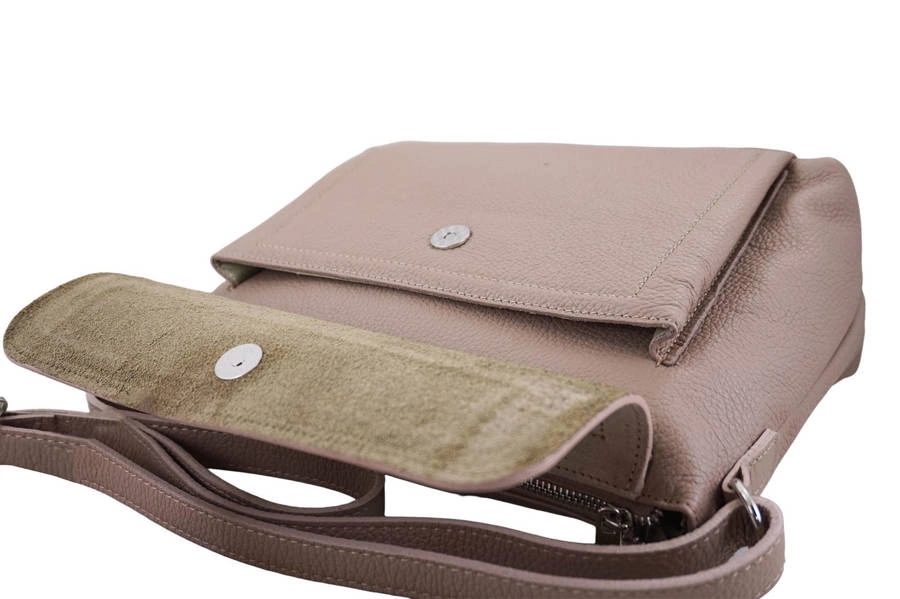 Torebka skórzana z zamszową klapką w kolorze różowym pudrowym jest wykonana ze skóry naturalnej licowej, w połączeniu ze skórą naturalną zamszową. Idealna propozycja wśród torebek na każdy dzień - duża ilość kieszeni powoduje, iż wszystkie niezbędne rzeczy do pracy będą na swoim miejscu, a szeroki i regulowany pasek umożliwia dostosowanie długości do noszenia torebki na ramieniu lub wygodnie przewieszonej przez ramię. Oferowane w najnowszej kolekcji torebki zaprojektowano tak, aby mieściły dokumenty, notatki, organizer lub notebook. Torebka skórzana z zamszową klapką to propozycja dla Pań ceniących gustowne dodatki codziennej garderoby, zwracających uwagę na jakość i estetykę wykonania produktu ze skóry naturalnej. Zachęcamy do zapoznania się ze szczegółową ofertą klasycznych torebek damskich skórzanych. Oferujemy również duży wybór portfeli ze skóry lakierowanej lub z kolorowym wnętrzem, zapakowanych w ozdobne, dopasowane pudełko.