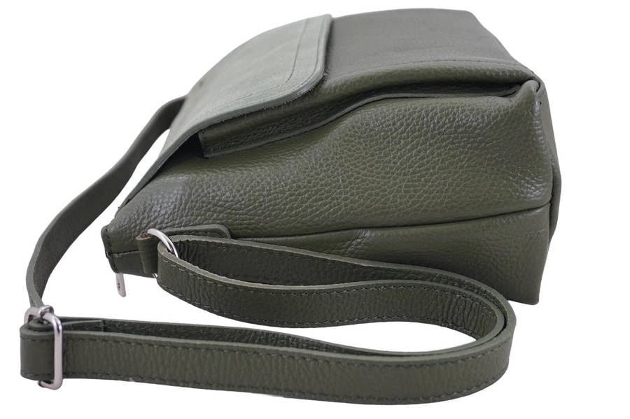 Wnętrze torebki: pojemna torebka skórzana z zamszową klapką jest jednokomorowa, wykończona podszewką. Wewnątrz wyodrębniono małą zasuwaną kieszonkę oraz kieszeń mieszczącą telefon. Z tyłu torebki znajduje się poręczna zasuwana kieszeń. Dodatkowo pod klapką znajduje się duża kieszeń zapinana na zatrzask (wymiary kieszeni: wysokość 16cm, szerokość 23cm). Wewnętrzne lub zewnętrzne kieszenie doskonale uporządkują drobne rzeczy, np. klucze, portfel, telefon oraz kosmetyki. Praktyczna torebka skórzana z zamszową klapką jest zasuwana, posiada srebrne okucia, wygodnej długości pasek z regulacją, mocowany na stałe (maksymalna dł. 120cm, maksymalna wys. 54cm, szerokość paska 2cm). Proponowana w najnowszej kolekcji pojemna torebka skórzana z zamszową klapką oraz z dużą ilością praktycznych kieszeni podkreśli codzienne klasyczne stylizacje.