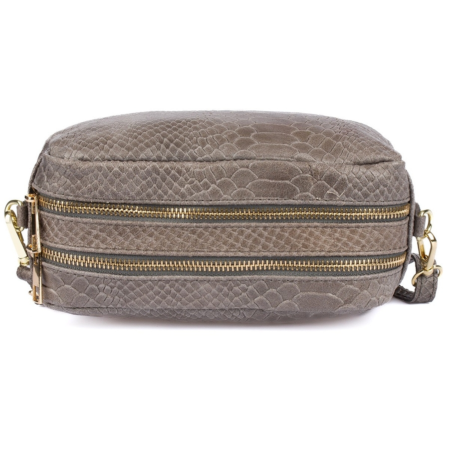 Elegancka skórzana torebka damska w kształcie kuferka – uszyta z wysokiej jakości skóry naturalnej. Ta bardzo stylowa, nieduża torebka z powodzeniem dopełni każdą stylizację – jej prosty, uniwersalny fason świetnie komponuje się zarówno z casualową, codzienną stylizacją, jak i strojem wieczorowym.Mimo niewielkich rozmiarów torebka jest bardzo pojemna – oprócz telefonu i portfela, zmieści się w niej wiele drobiazgów potrzebnych na co dzień. Mały kalendarz, etui na okulary, czytnik ebooków i słodka przekąska – bez problemu włożysz je do tej torebki! Pasek jest odpinany, więc możesz nosić ją tak, jak lubisz: w ręku, na ramieniu lub jako torebkę cross-body! Oprócz tego regulacja paska umożliwia wygodne dostosowanie jego długości do własnych upodobań.To ponadczasowy model, który z pewnością doda uroku każdej stylizacji – pasuje do sukienki i do jeansów, pięknie podkreśli kobiecy garnitur! Wewnątrz torebki: dwie główne komory oraz mała, zasuwana kieszonka na telefon lub dokumenty. Wnętrze wykończono solidną, grubą podszewką.W tej aukcji oferujemy torebkę w pięknym szarym kolorze.