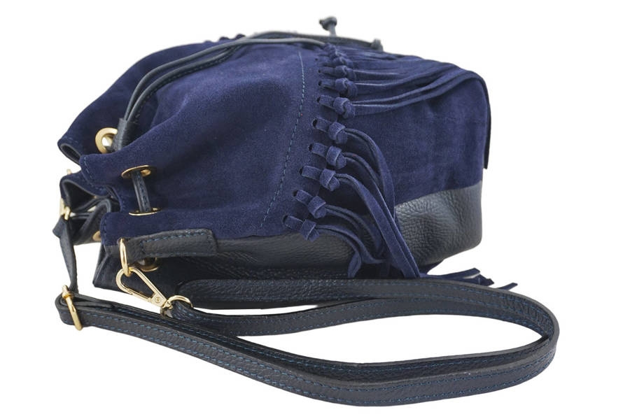 Wnętrze torebki: modna torebka skórzana boho style z frędzlami jest wykończona podszewką. Wewnątrz wyodrębniono małą zasuwaną kieszonkę mieszczącą drobne kosmetyki. Granatowa torebka skórzana boho style posiada złote okucia, długi dopinany i regulowany pasek (maksymalna dł. 114cm, maksymalna wys. 60cm), jest zamykana ozdobnym troczkiem ze skóry licowej. Wybierz ten model torebki wyróżniający się zamszowym przodem z modnymi frędzlami. Dopasuj również kolorowy skórzany portfel z szerokiej oferty portfeli skórzanych damskich.