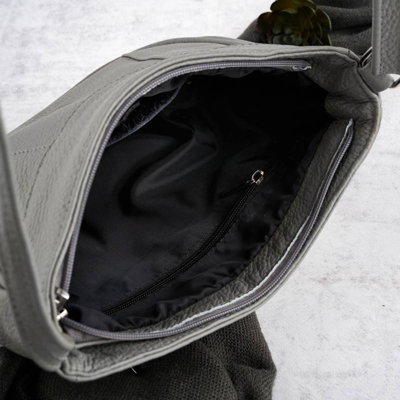 Komora główna jest zapinana na suwak, co zabezpiecza przechowywaną w niej zawartość. Na wnętrze składają się: wsuwana kieszeń na telefon oraz kieszonka na suwak. Ta niepozornych rozmiarów torebka nie raz, nie dwa zaskoczy Cię ilością miejsca do przechowywania. Ponadto, do dyspozycji masz również tylną kieszeń na suwak, na najczęściej wyciągane drobiazgi.