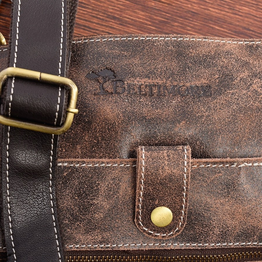 Elegancka skórzana torba męska – uszyta z wysokogatunkowej skóry naturalnej typu nubuk, stylizowanej na vintage. To wyjątkowa, oryginalna torba wyprodukowana przez polską markę Beltimore.Podczas produkcji zadbano o wysoką jakość wykonania: wnętrze wykończono mocną podszewką, wykorzystano solidne okucia w kolorze postarzanego złota.Wnętrze torby jest świetnie zorganizowane: główna komora posiada 3 kieszenie, w tym jedną zasuwaną.W torbie zmieszczą się dokumenty formatu A4 i tablet, oprócz tego wiele drobiazgów.Mocny parciany pasek, obszyty skórą, jest regulowany w zakresie 85-100cm.Na zewnątrz znajdują się 4 pojemne kieszenie różnych rozmiarów (na froncie) oraz jedna z tyłu.