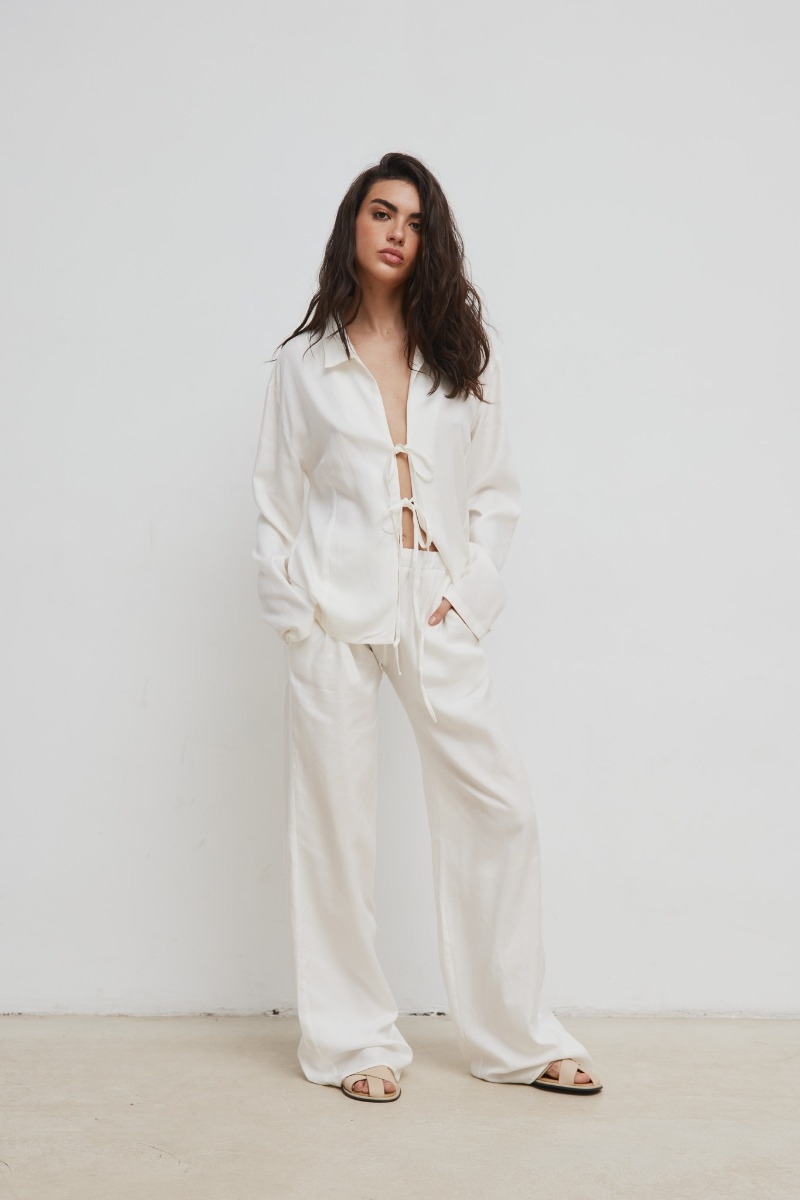 Spodnie ASPRO wykonane są z niesamowicie przyjemnej w dotyku tkaniny w kolorze białym , co sprawia, że noszenie ich jest bardzo komfortowe. Mają luźny krój, dzięki czemu zapewniają swobodę ruchów. Materiał ładnie się "leje" i układa dodaje im lekkości i elegancji. W pasie znajduje się elastyczna guma oraz sznurek, dzięki czemu można dopasować je do swojej figury. Dodatkowo, spodnie posiadają kieszenie po bokach - praktyczne i wygodne . Ten model spodni ma niezwykle kobiecy i zwiewny fason, który podkreśla zmysłowość i nadaje wyjątkowy charakter każdej stylizacji. Można je zestawić z różnymi elementami garderoby, ponieważ pasują zarówno do casualowych, jak i bardziej eleganckich looków. Świetnie będą wyglądać zarówno ze zwiewnymi bluzkami czy topami, jak i z dopasowanymi t-shirtami bądź koszulami. Mogą być noszone zarówno w połączeniu z butami na płaskim obcasie, jak i z wysokimi szpilkami lub sandałkami. Dzięki swojej uniwersalności, te spodnie stanowią świetną bazę do stworzenia różnorodnych stylizacji odpowiednich na wiele okazji. Tworzą TOTAL LOOK z koszulą CASTRO w tym samym kolorze . Gramatura tkaniny : 160g m² Skład: 90% Tencel, 10% Len