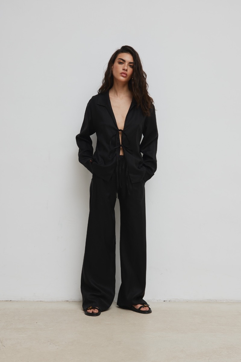 Spodnie ASPRO wykonane są z niesamowicie przyjemnej w dotyku tkaniny w kolorze czarnym , co sprawia, że noszenie ich jest bardzo komfortowe. Mają luźny krój, dzięki czemu zapewniają swobodę ruchów. Materiał ładnie się "leje" i układa dodaje im lekkości i elegancji. W pasie znajduje się elastyczna guma oraz sznurek, dzięki czemu można dopasować je do swojej figury. Dodatkowo, spodnie posiadają kieszenie po bokach - praktyczne i wygodne . Ten model spodni ma niezwykle kobiecy i zwiewny fason, który podkreśla zmysłowość i nadaje wyjątkowy charakter każdej stylizacji. Można je zestawić z różnymi elementami garderoby, ponieważ pasują zarówno do casualowych, jak i bardziej eleganckich looków. Świetnie będą wyglądać zarówno ze zwiewnymi bluzkami czy topami, jak i z dopasowanymi t-shirtami bądź koszulami. Mogą być noszone zarówno w połączeniu z butami na płaskim obcasie, jak i z wysokimi szpilkami lub sandałkami. Dzięki swojej uniwersalności, te spodnie stanowią świetną bazę do stworzenia różnorodnych stylizacji odpowiednich na wiele okazji. Tworzą TOTAL LOOK z koszulą CASTRO w tym samym kolorze . Skład: 90% Tencel, 10% Len ZALECANA PIELĘGNACJA: