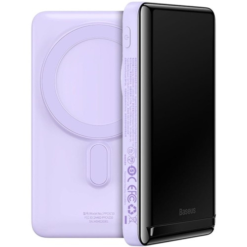 Baseus Magnetic Bracket powerbank 10000mAh USB-C 20W  Urządzenia z funkcją ładowania Qi oraz MagSafe   Pomoc w zasięgu ręki Często biwakujesz, podróżujesz? A może jesteś ciągle zabiegany i nie masz czasu ładować swojego telefonu w domu, a bateria ledwo żyję? Z pomocą przychodzi powerbank Magnetic Bracket od firmy Baseus. Ten bezprzewodowy powerbank poratuje Cię, gdy zapomnisz kabla, ale również z kablem da radę, dzięki pojemność aż 10 000mAh! W zestawie: Powerbank Magnetic Bracket, kabel USB-C do USB-C (50cm), instrukcja obsługi w j. angielskim Kolor producenta: Purple (fioletowy)       Ładowanie na żądanie Powerbank jest kompatybilny z funkcją MagSafe* oraz smartfonami z obsługą Qi. Posiada także port USB-C, który służy do ładowania zarówno Twojego urządzenia, jak i samego powerbanka.  * Funkcja magnetyczna MagSafe działa tylko i wyłącznie bezpośrednio do telefonu lub do etui z wbudowanym oczkiem magnetycznym o zastosowaniu MagSafe. Specyfikacja: Materiały: PC+ABS Pojemność: 10000mAh 3,85V 38.5Wh Pojemność znamionowa: 5800mAh (5V / 3A) Moc wyjściowa ładowania bezprzewodowego: 5W, 7.5W, 10W, 15W Napięcie wejściowe Type-C: 5V/3A, 9V/2A Napięcie wyjściowe Type-C: 5V/3A, 9V/2.22A, 12V/1.5A (20W) Całkowita wydajność: 5V/3A Waga: 220g Wymiary: 117,3 x 69,7 x 20,3mm   Lepiej być nie może  Powerbank posiada delikatne, matowe wykończenie oraz błyszczący, ciemny przód, który również posiada wyświetlacz pokazujący aktualny poziom baterii. Chcesz podczas ładowania użytkować telefon w pionie? Magnetic Bracket umożliwi Ci to dzięki wbudowanej nóżce. Urządzenie posiada czujniki przeciwprzepięciowe oraz przeciwprzeciążeniowe.