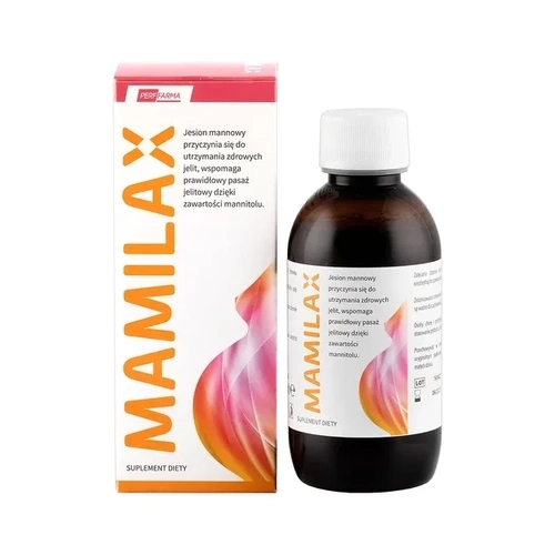 Suplement diety Mamilax płyn uzupełnia codzienną dietę w mannitol z jesionu mannowego i w błonnik. Stosowanie preparatu jest polecane dla osób dorosłych jako wsparcie dla utrzymania zdrowych jelit oraz prawidłowego pasażu jelitowego.