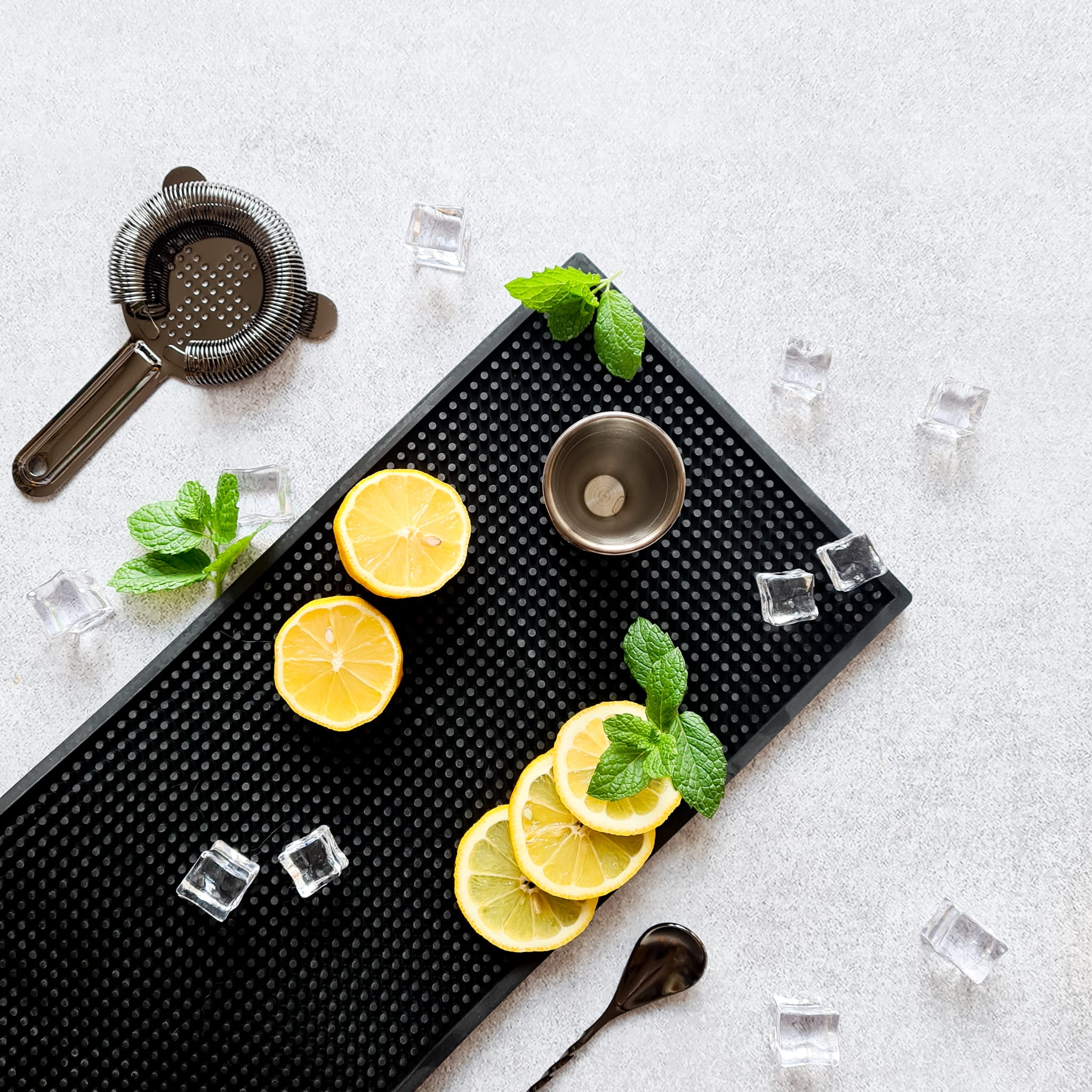 Mata barmańska XL - dla wygody i czystości Mata barmańska XL zapewnia czystość w miejscu, w którym robimy drinki. Rozlany alkohol, soki i syropy, zamiast na kuchenny blat czy stół, trafiają na matę barmańską! Dzięki temu oszczędzamy czas - nie poświęcamy go na sprzątanie po każdym drinku. Mata jest bardzo wygodna. Zmieści się na niej dużo akcesoriów barmańskich, butelek i kieliszków. Dzięki temu, że mata ma kształt podłużnego prostokąta o wymiarach 60 x 20 cm, wszystko będziemy mieć na wyciągnięcie ręki. Mata barmańska jest także bardzo estetyczna. Zachowuje swój dobry wygląd nawet po zrobieniu kilkunastu drinków. Wszystko dzięki temu, że płyny spływają między ząbki i są mniej widoczne. W ten sposób nasze stanowisko robienia drinków długo wygląda czysto.Mata barmańska znacząco poprawi komfort i estetykę pracy każdego barmana, zarówno domowego jak i profesjonalnego. Mata barmańska - jak to działa? Mata barmańska złożona jest z setek ząbków otoczonych rantem. Gdy podczas robienia drinków odkładamy na nią shaker, miarki czy butelki, wszystkie płyny ściekają między ząbki maty. Dzięki otaczającemu matę rantowi nie rozlewają się one dalej. Mata barmańska XL - łatwa w czyszczeniu Mata barmańska jest łatwa w czyszczeniu. Wystarczy spłukać ją ciepłą wodą i jest gotowa do użycia. Gdy pojawią się mocniejsze zabrudzenia, ich usunięcie także nie sprawia kłopotu. Ząbki są elastyczne, dzięki czemu bez trudu dotrzemy do zabrudzeń i usuniemy je gąbką lub szczotką kuchenną. Mata barmańska XL - wysoka jakość Mata barmańska XL to produkt wysokiej jakości. Wykonana jest z bardzo elastycznego, naturalnego kauczuku. Została wyprodukowana przez doświadczonego włoskiego producenta profesjonalnych akcesoriów barmańskich. Mata barmańska XL - cechy produktu: Wygodna, funkcjonalna, estetyczna mata. Istotnie poprawia komfort i estetykę pracy. Wyprodukowana przez doświadczonego włoskiego producenta profesjonalnych akcesoriów barmańskich Wykonana z naturalnego kauczuku. Kolor: czarny. Wymiary: 60x20 cm, wersja XL. Łatwo utrzymać ją w czystości. Potrzebujesz więcej mat barmańskich w innych rozmiarach? Zapraszamy do zapoznania się z naszą ofertą mat barmańskich.