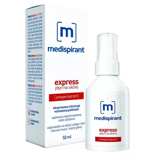 Profesjonalny antyperspirant do stosowania w przypadku nadmiernej potliwości. Medispirant Express Płyn na skórę zapewnia natychmiastowy i długo utrzymujący się efekt. Można go aplikować w nagłych sytuacjach m.in. na twarz, skórę głowy oraz dłonie.