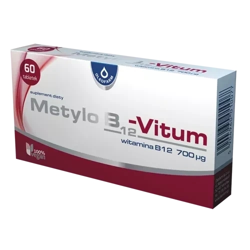 Suplement diety Metylo B12-Vitum w jednej tabletce zawiera aż 700mcg witaminy B12, co stanowi 28 000% referencyjnej wartości spożycia. Wspomaga ona m.in. prawidłową produkcję czerwonych krwinek i pomaga utrzymać prawidłowy metabolizm homocysteiny.