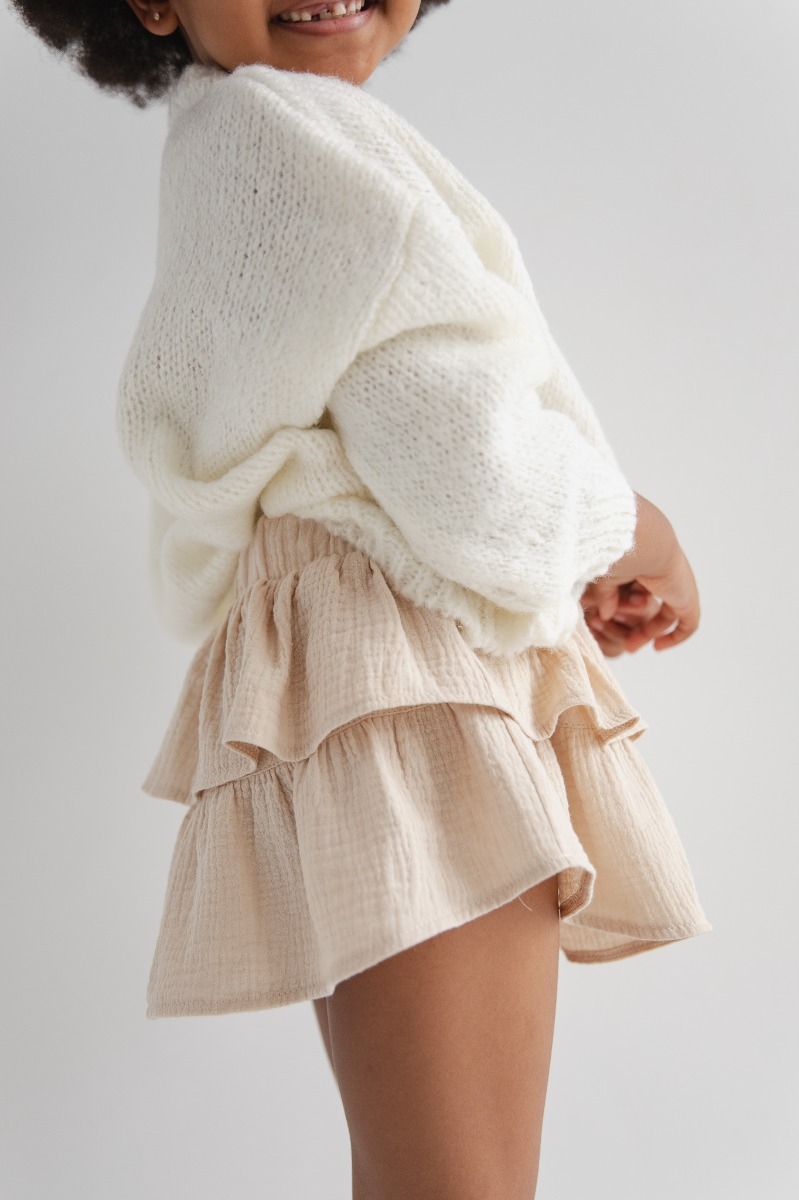 Spódniczka z falbankami w kolorze beżowym wykonana z muślinu . Niezwykle uroczy fason dzięki podwójnej warstwie falbanek. Umieszczona w pasie guma nie krępuje ruchów i dopasowuje się do ciała. Delikatny, przewiewny materiał. Idealnie sprawdzi się zarówno na co dzień jak i na wyjątkowe okazje. Wykorzystasz ją przez cały rok! Modelka ma 114 cm wzrostu prezentuje rozmiar (116-122) Skład: 100% Bawełna (muślin bawełniany z certyfikatem GOTS) PRODUKT POLSKI - Marsala Collection ZALECANA PIELĘGNACJA: