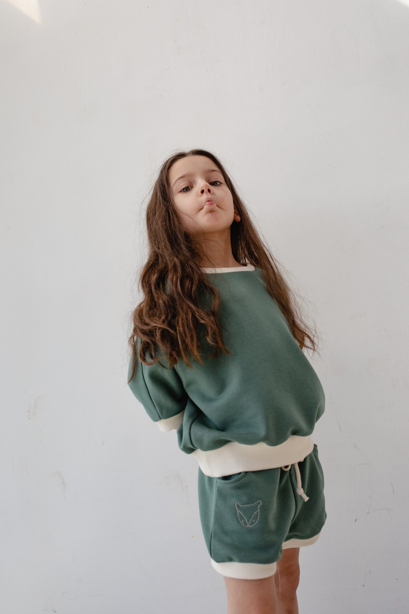 Bluza w kolorze morskiej zieleni. Rękaw 3/4 zakończony ściągaczem. Półokrągły dekolt. Obniżona linia ramion oraz skośne przeszycia przy rękawach. Tył zupełnie gładki. W przedniej części znajduje się minimalistyczny haft - lisek. Kontrastowy ściągacz w kolorze light beige. Bluza nie posiada ocieplenia. Idealnie współgra z innymi kolorami. Tworzy komplet ze spodniami DISPLAY oraz BOBBY Modelka ma 110 cm wzrostu prezentuje rozmiar (104-110) Skład: 90% Bawełna , 10% Poliester PRODUKT POLSKI - Marsala Collection ZALECANA PIELĘGNACJA: