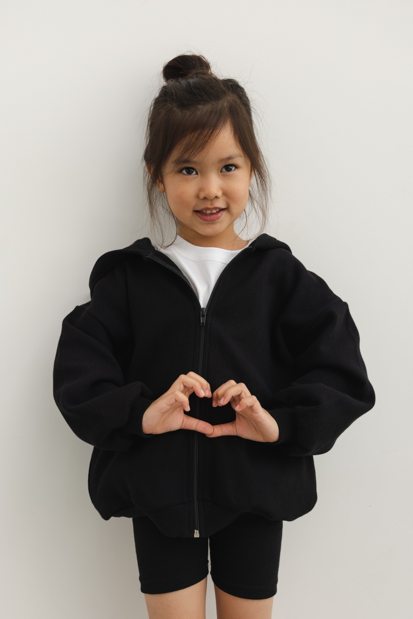 Mini bluza wykonana z dzianiny waflowej w kolorze czarnym. Obszerny krój, rękawy długie ,proste. Model posiada kaptur oraz kieszonki po bokach. Bluza zapinana na zamek. Tył zupełnie gładki. Rękaw jak i dół bluzy został wykończony ściągaczem. Idealna propozycja dla każdego dziecka . Unisex fason będzie właściwy dla chłopca oraz dziewczynki. Bardzo wygodna propozycja do stylizacji na każdy dzień . Dostępna również w kolorze beżowym. Modelka ma 118 cm wzrostu i prezentuje rozmiar 116-122 cm. Skład:100% Bawełna PRODUKT POLSKI - Marsala Collection ZALECANA PIELĘGNACJA: