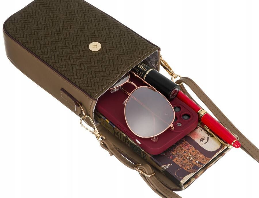 Mała torebka na długim, odpinanym pasku ze skóry ekologicznej. Na rewersie posiada kieszonkę zapinaną klapką na zatrzask magnetyczny. Wyposażona w 6 miejsc na karty.