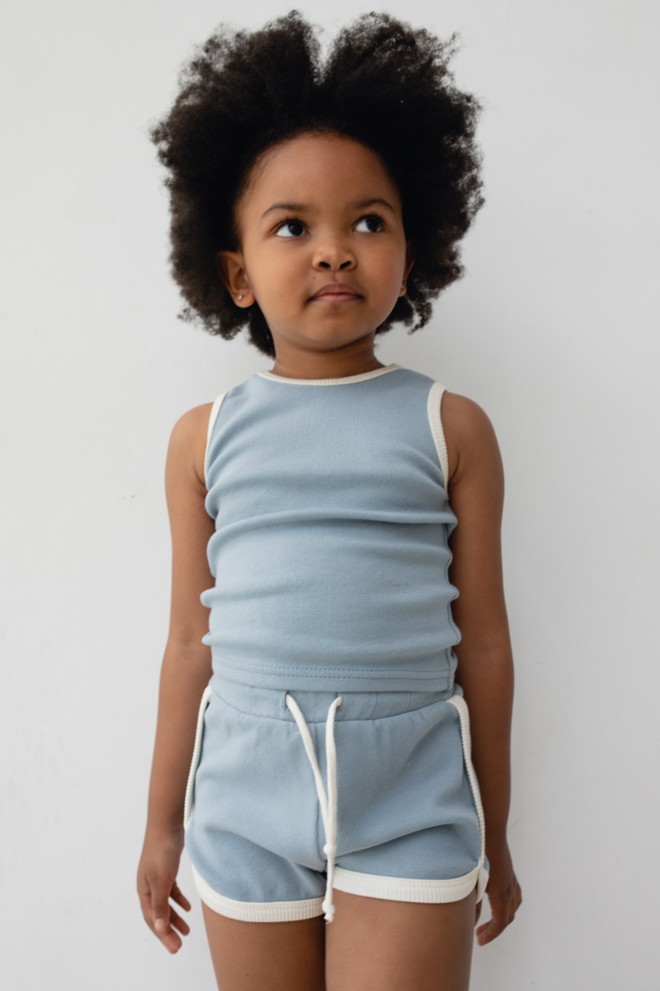 Spodenki z prążkowanej dzianiny w kolorze błękitnym Model wyposażony został w gumę oraz dodatkowe wiązanie. Jasnobeżowe obszycie stanowi element ozdobny i przełamuję prostotę tego modelu. Delikatnie zaokrąglone nogawki. Nie posiada kieszonek. Tył zupełnie gładki. Pastelowy odcień stanowi bazę do stworzenia wielu stylizacji. Tworzy komplet z topem JUMPY Modelka ma 110 cm wzrostu prezentuje rozmiar (116-122) Skład: 95% Bawełna , 5% Elastan ZALECANA PIELĘGNACJA: