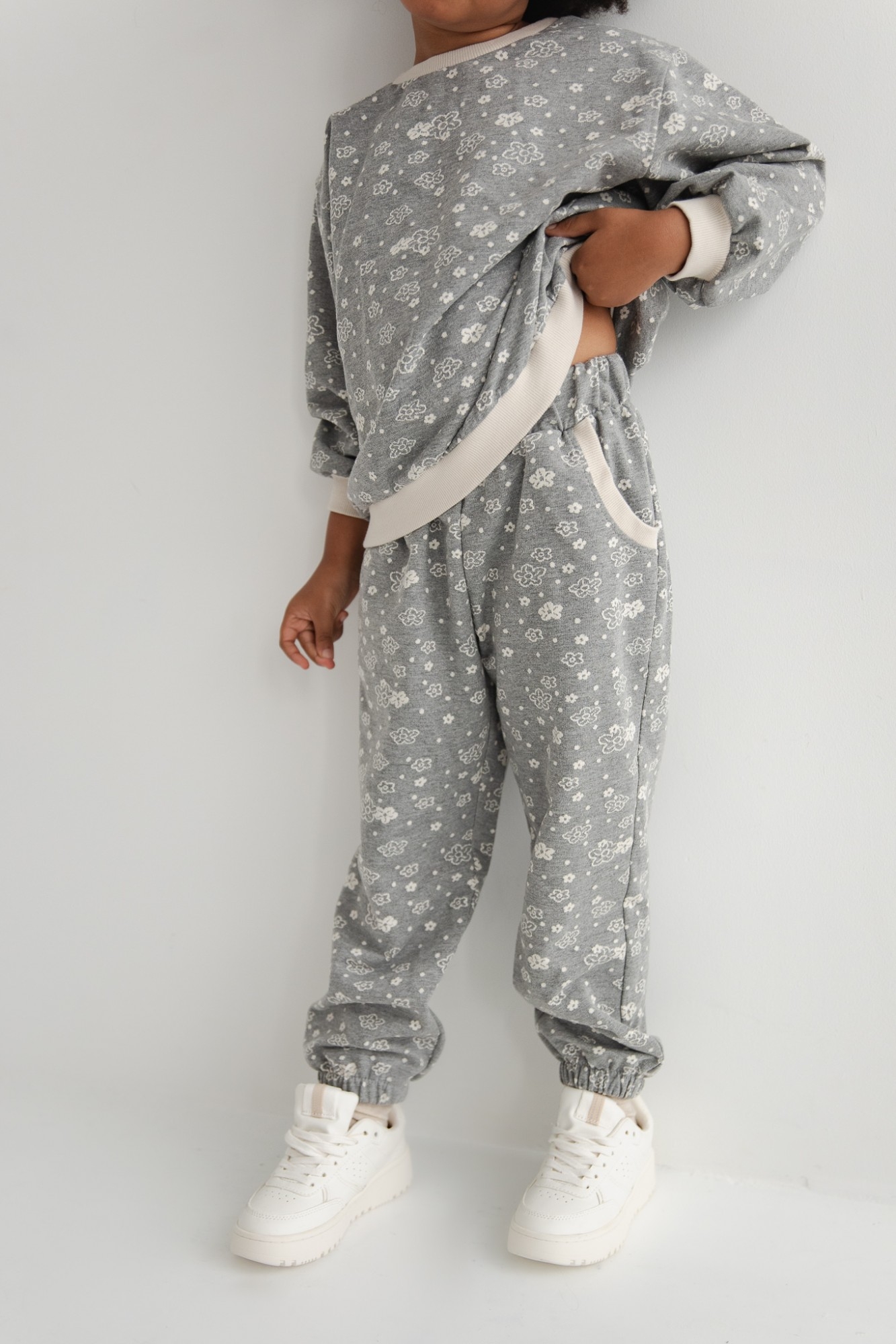 Joggery wykonane z dzianiny dresowej w kolorze szarym z printem w kwiatuszki. Spodnie nie posiadają ocieplenia. Model o luźnym kroju, z wysokim stanem oraz charakterystycznym wykończeniem nogawki - wszyta guma. . W pasie również znajduje się guma, która umożliwi dopasowanie się do ciała - gwarantuje maksymalny komfort podczas noszenia. Z przodu zostały umieszczone dwie kieszonki wykończone ściągaczem w kolorze beżowym . Tył zupełnie gładki. Jeden z modeli, które pozwalają na stworzenie wygodnych i bardzo modnych w ostatnich sezonach stylówek. Dostępne w kilku kolorach! Modelka ma 114 cm wzrostu prezentuje rozmiar (116-122) Skład: 90% Bawełna 10% Poliester PRODUKT POLSKI - Marsala Collection ZALECANA PIELĘGNACJA: