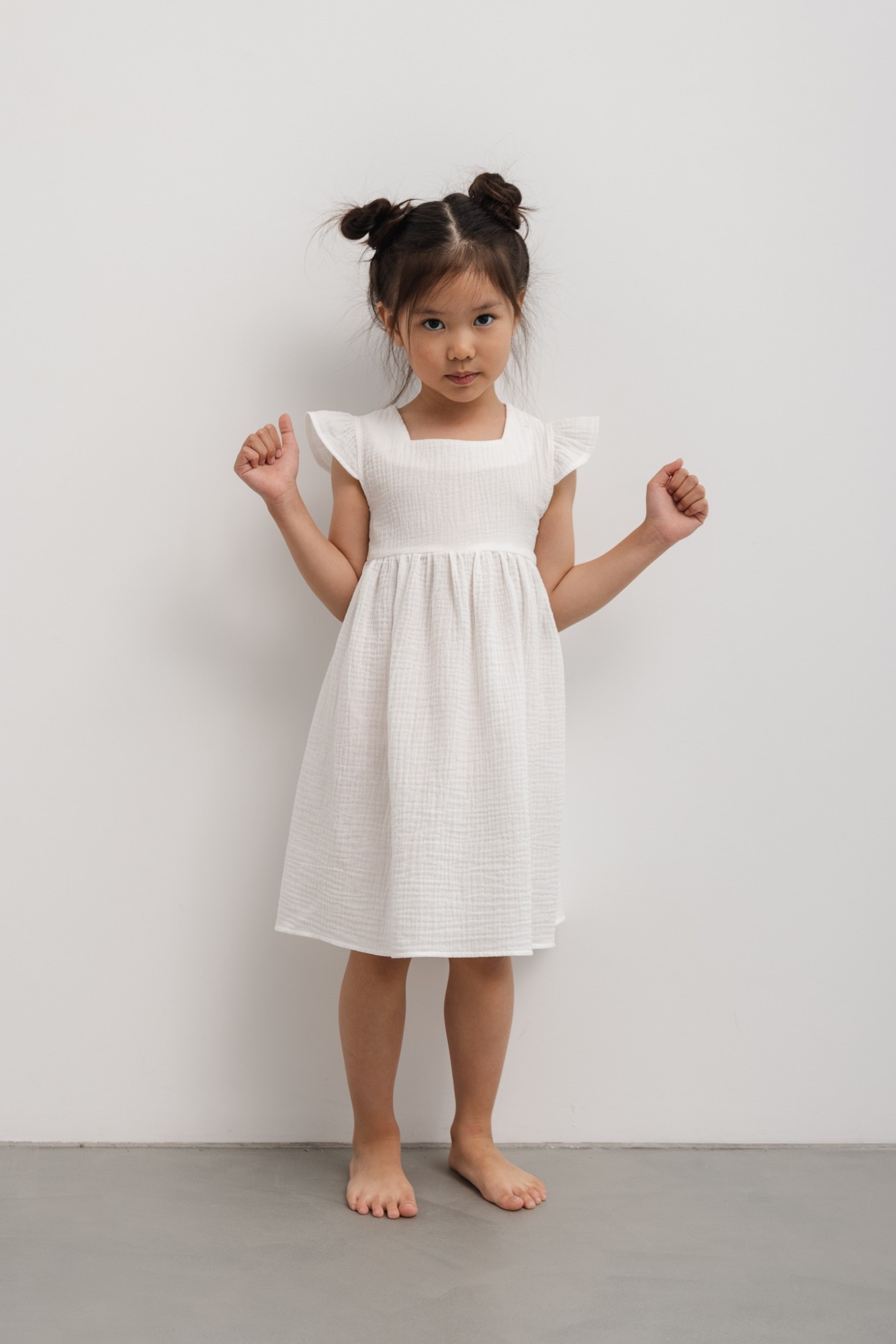 Sukienka wykonana z muślinu w kolorze białym . Fason o przedłużonym kroju z krótkim rękawkiem w formie falbanki . Całość odcięta pod linią biustu. Z tyłu zapięcie na mały guziczek. Minimalistyczny model który dopasuje się do każdej sylwetki . Lekka sukienka która nie będzie krępować ruchów. Dostępna również w innych kolorach . Modelka ma 118 cm wzrostu prezentuje rozmiar 116-122. Skład: 100% Bawełna PRODUKT POLSKI - Marsala Collection ZALECANA PIELĘGNACJA: