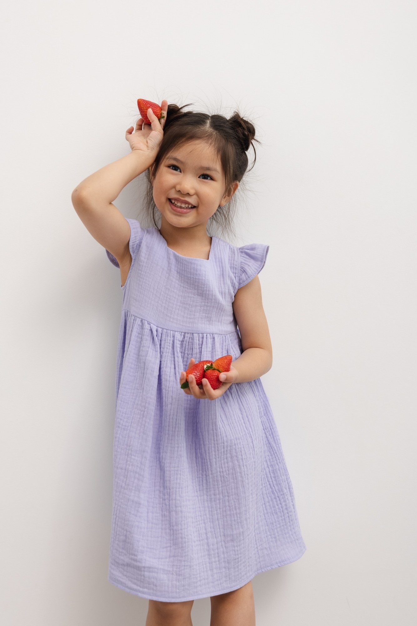 Sukienka wykonana z muślinu w kolorze fioletowym . Fason o przedłużonym kroju z krótkim rękawkiem w formie falbanki . Całość odcięta pod linią biustu. Z tyłu zapięcie na mały guziczek. Minimalistyczny model który dopasuje się do każdej sylwetki . Lekka sukienka która nie będzie krępować ruchów. Dostępna również w innych kolorach . Modelka ma 118 cm wzrostu prezentuje rozmiar 116-122. Skład: 100% Bawełna PRODUKT POLSKI - Marsala Collection ZALECANA PIELĘGNACJA: