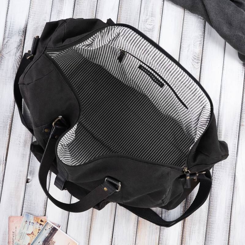 Duża męska torba weekendowa została wykonana z bawełnianego, impregnowanego canvasu oraz 100% skóry wegańskiej. Do jej produkcji zastosowano mocne nici oraz designerską, bawełnianą podszewkę w paski. Produkt mieści format A4 i posiada przegrodę dedykowaną na sprzęt elektroniczny, wyłożoną pianką dystansową. Torba jest zapinana na suwak, posiada kieszeń frontową na często wyciągane akcesoria. W komorze głównej umieszczono kieszonkę na suwak. Produkt można nosić na ramieniu lub w dłoni.