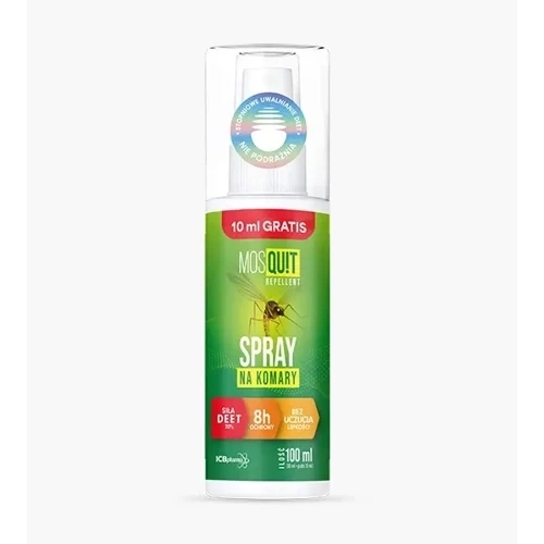 Mosquit Repellent spray to preparat, który odstrasza komary. Jego działanie utrzymuje się nawet do 8 godzin. W składzie zawarto 20% DEET, dzięki temu, że ma on postać mikrokapsułek jest uwalniany stopniowo. Można stosować od 12. roku życia.