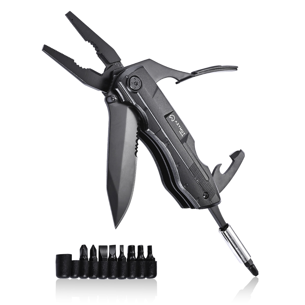 Multitool AZYMUT Gron to taktyczny multitool który z wyglądu przypomina bardziej scyzoryk z wbudowanymi kombinerkami, ale w swojej budowie kryje aż 11 różnego rodzaju narzędzi przydatnych w codziennym użytkowaniu oraz aż 9 różnych bitów do wkrętaka.